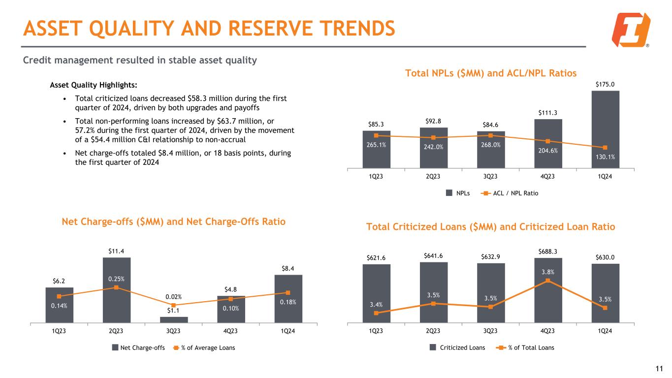 ACL Highlights: • Funded ACL remained unchanged at 1.25% of loans • Off-balance sheet commitments declined, leading to a modest unfunded commitment release • On-balance sheet construction loans declined, due generally to projects moving to permanent financing; Construction loans receive a higher provision than Commercial Real Estate loans ALLOWANCE FOR CREDIT LOSSES (ACL) ACL ($MM) and Funded ACL/LHFI Ratio $243.9 $245.4 $245.5 $246.1 $243.1 $226.1 $224.6 $226.7 $227.7 $227.7 $17.8 $20.8 $18.8 $18.4 $15.4 1.24% 1.23% 1.24% 1.25% 1.25% Funded ACL Unfunded ACL Funded ACL % of LHFI 1Q23 2Q23 3Q23 4Q23 1Q24 10 ACL Roll-forward ($MM) Funded Unfunded Investments Total ACL 12/31/23 $227.7 $18.4 $0.8 $246.9 ACL Provision (Reversal) 8.4 (3.0) (0.1) 5.3 Net Charge-offs 8.4 — — 8.4 ACL 3/31/24 $227.7 $15.4 $0.7 $243.8 * Line items may not sum due to rounding