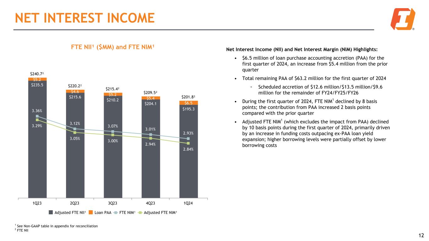 Asset Quality Highlights: • Total criticized loans decreased $58.3 million during the first quarter of 2024, driven by both upgrades and payoffs • Total non-performing loans increased by $63.7 million, or 57.2% during the first quarter of 2024, driven by the movement of a $54.4 million C&I relationship to non-accrual • Net charge-offs totaled $8.4 million, or 18 basis points, during the first quarter of 2024 ASSET QUALITY AND RESERVE TRENDS Net Charge-offs ($MM) and Net Charge-Offs Ratio $6.2 $11.4 $1.1 $4.8 $8.4 0.14% 0.25% 0.02% 0.10% 0.18% Net Charge-offs % of Average Loans 1Q23 2Q23 3Q23 4Q23 1Q24 Credit management resulted in stable asset quality Total NPLs ($MM) and ACL/NPL Ratios $85.3 $92.8 $84.6 $111.3 $175.0 265.1% 242.0% 268.0% 204.6% 130.1% NPLs ACL / NPL Ratio 1Q23 2Q23 3Q23 4Q23 1Q24 Total Criticized Loans ($MM) and Criticized Loan Ratio $621.6 $641.6 $632.9 $688.3 $630.0 3.4% 3.5% 3.5% 3.8% 3.5% Criticized Loans % of Total Loans 1Q23 2Q23 3Q23 4Q23 1Q24 11