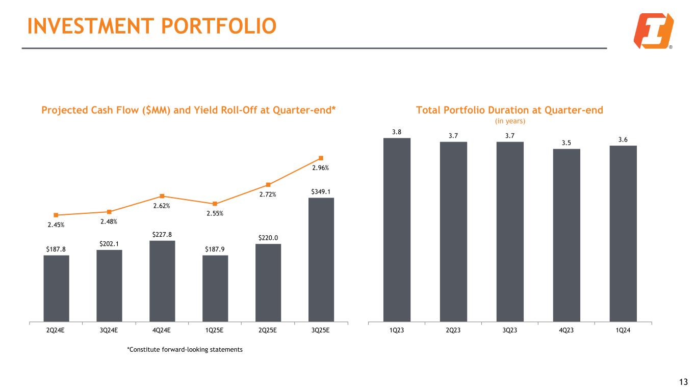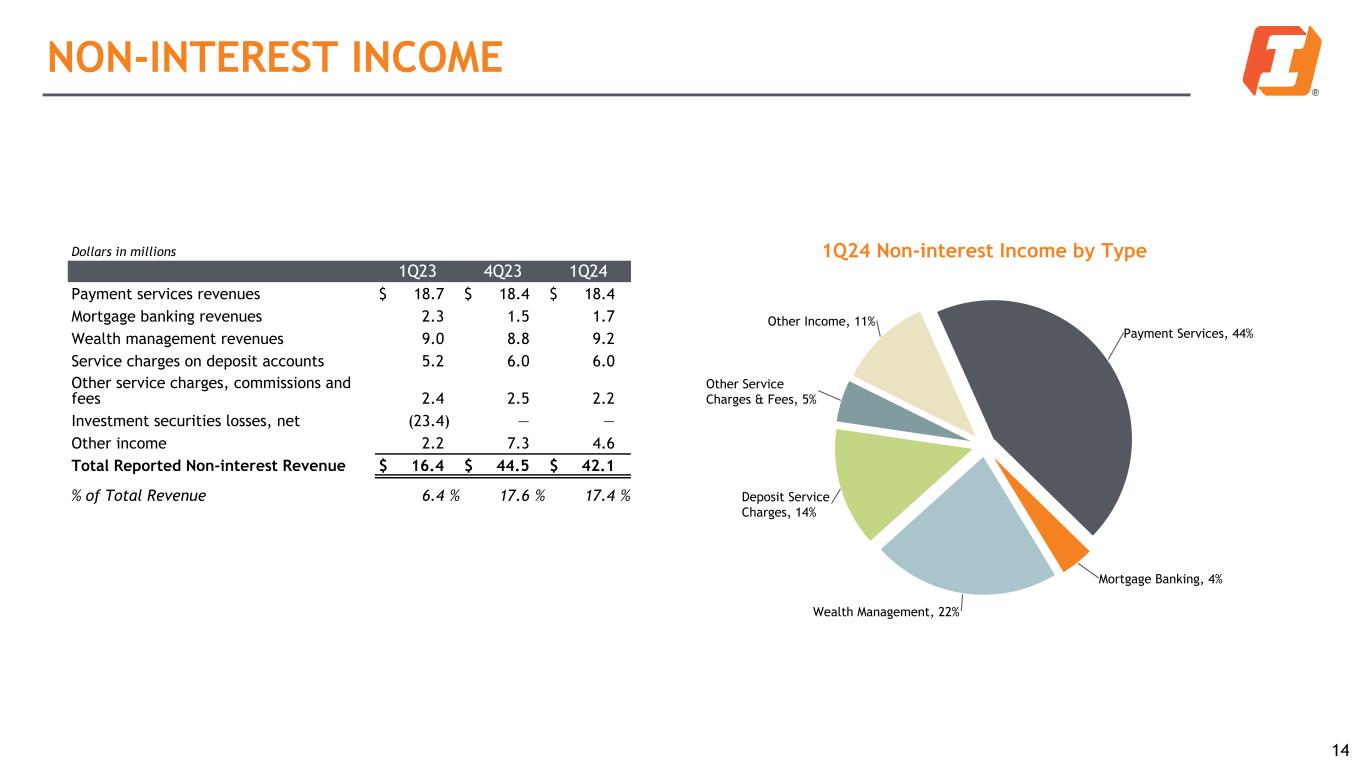 Net Interest Income (NII) and Net Interest Margin (NIM) Highlights: • $6.5 million of loan purchase accounting accretion (PAA) for the first quarter of 2024, an increase from $5.4 million from the prior quarter • Total remaining PAA of $63.2 million for the first quarter of 2024 ◦ Scheduled accretion of $12.6 million/$13.5 million/$9.6 million for the remainder of FY24/FY25/FY26 • During the first quarter of 2024, FTE NIM1 declined by 8 basis points; the contribution from PAA increased 2 basis points compared with the prior quarter • Adjusted FTE NIM1 (which excludes the impact from PAA) declined by 10 basis points during the first quarter of 2024, primarily driven by an increase in funding costs outpacing ex-PAA loan yield expansion; higher borrowing levels were partially offset by lower borrowing costs NET INTEREST INCOME FTE NII¹ ($MM) and FTE NIM¹ $235.5 $215.6 $210.2 $204.1 $195.3 $5.2 $4.6 $5.2 $5.4 $6.5 $240.7² $220.2² $215.4² $209.5² $201.8² 3.36% 3.12% 3.07% 3.01% 2.93% 3.29% 3.05% 3.00% 2.94% 2.84% Adjusted FTE NII¹ Loan PAA FTE NIM¹ Adjusted FTE NIM¹ 1Q23 2Q23 3Q23 4Q23 1Q24 12 1 See Non-GAAP table in appendix for reconciliation 2 FTE NII