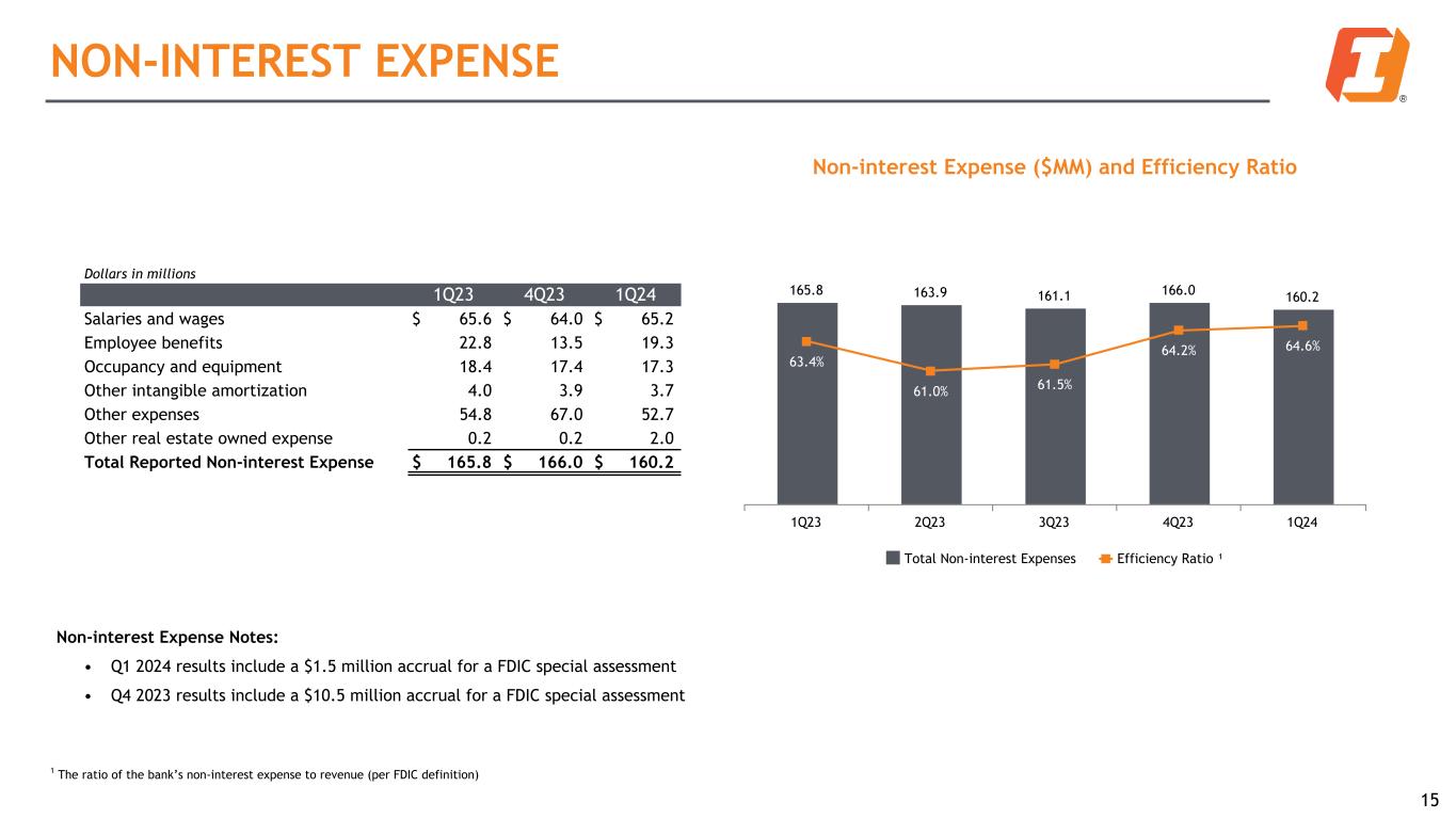 14 1Q24 Non-interest Income by Type Payment Services, 44% Mortgage Banking, 4% Wealth Management, 22% Deposit Service Charges, 14% Other Service Charges & Fees, 5% Other Income, 11% Dollars in millions 1Q23 4Q23 1Q24 Payment services revenues $ 18.7 $ 18.4 $ 18.4 Mortgage banking revenues 2.3 1.5 1.7 Wealth management revenues 9.0 8.8 9.2 Service charges on deposit accounts 5.2 6.0 6.0 Other service charges, commissions and fees 2.4 2.5 2.2 Investment securities losses, net (23.4) — — Other income 2.2 7.3 4.6 Total Reported Non-interest Revenue $ 16.4 $ 44.5 $ 42.1 % of Total Revenue 6.4 % 17.6 % 17.4 % NON-INTEREST INCOME