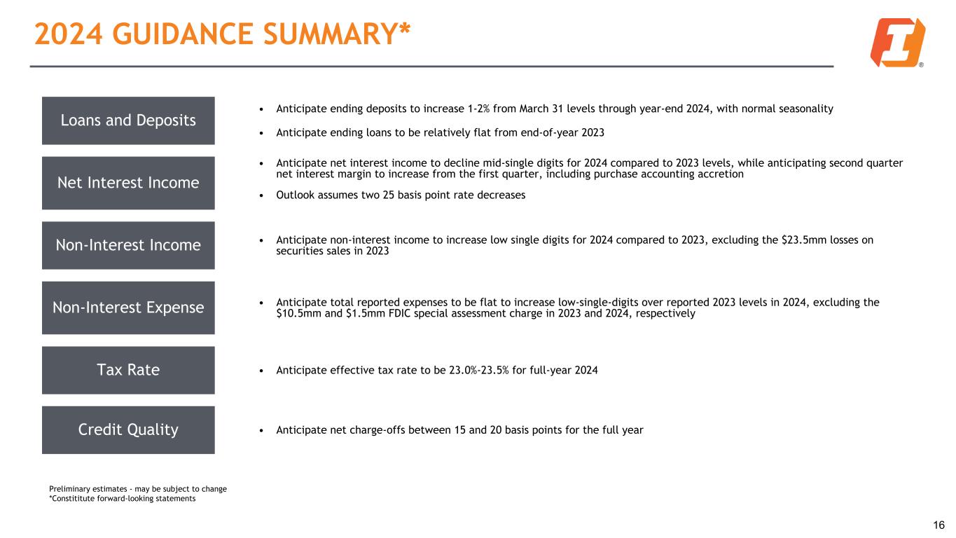 NON-INTEREST EXPENSE 15 Dollars in millions 1Q23 4Q23 1Q24 Salaries and wages $ 65.6 $ 64.0 $ 65.2 Employee benefits 22.8 13.5 19.3 Occupancy and equipment 18.4 17.4 17.3 Other intangible amortization 4.0 3.9 3.7 Other expenses 54.8 67.0 52.7 Other real estate owned expense 0.2 0.2 2.0 Total Reported Non-interest Expense $ 165.8 $ 166.0 $ 160.2 Non-interest Expense ($MM) and Efficiency Ratio 165.8 163.9 161.1 166.0 160.2 63.4% 61.0% 61.5% 64.2% 64.6% Total Non-interest Expenses Efficiency Ratio ¹ 1Q23 2Q23 3Q23 4Q23 1Q24 1 The ratio of the bank’s non-interest expense to revenue (per FDIC definition) Non-interest Expense Notes: • Q1 2024 results include a $1.5 million accrual for a FDIC special assessment • Q4 2023 results include a $10.5 million accrual for a FDIC special assessment