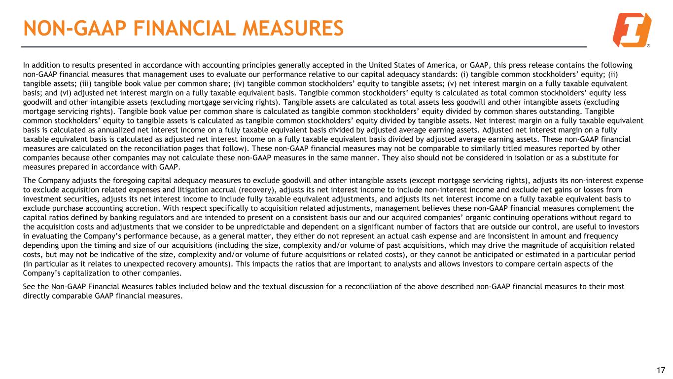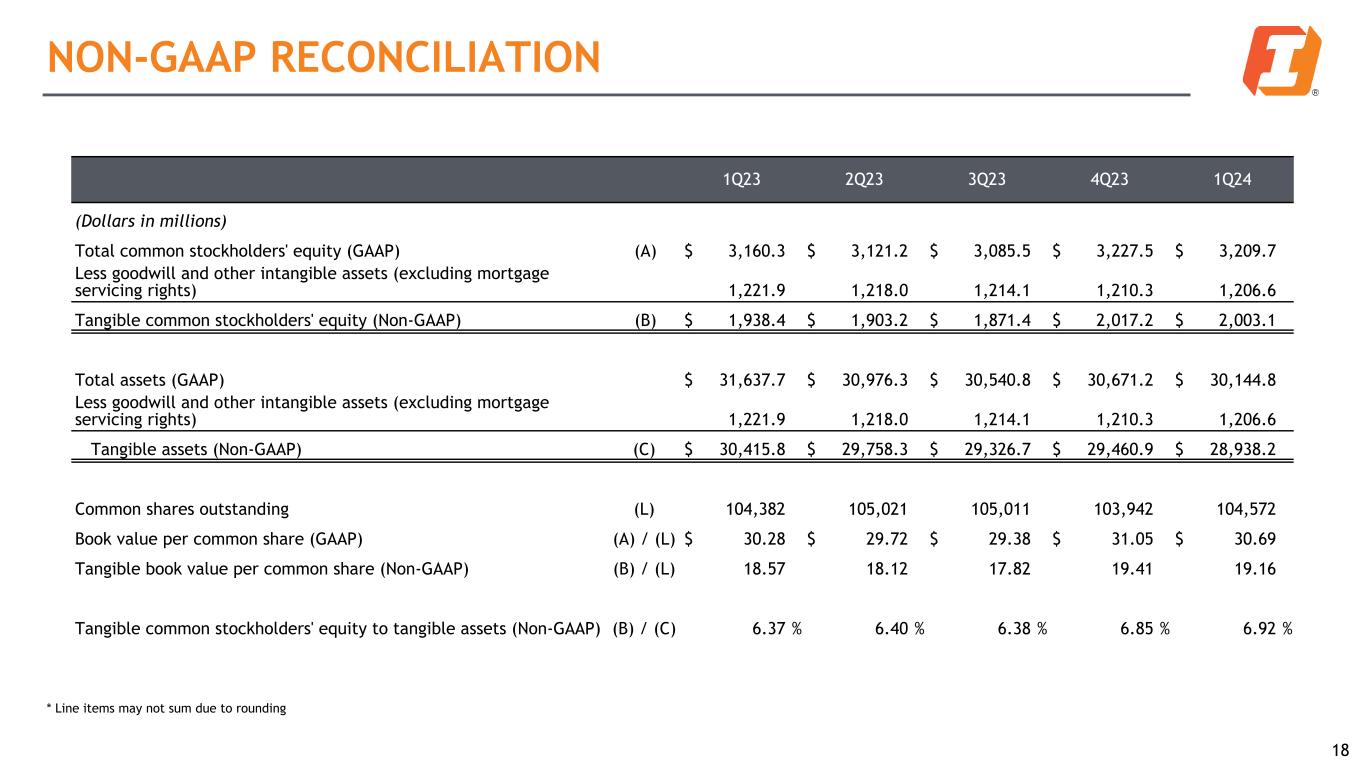 NON-GAAP FINANCIAL MEASURES 17 In addition to results presented in accordance with accounting principles generally accepted in the United States of America, or GAAP, this press release contains the following non-GAAP financial measures that management uses to evaluate our performance relative to our capital adequacy standards: (i) tangible common stockholders’ equity; (ii) tangible assets; (iii) tangible book value per common share; (iv) tangible common stockholders’ equity to tangible assets; (v) net interest margin on a fully taxable equivalent basis; and (vi) adjusted net interest margin on a fully taxable equivalent basis. Tangible common stockholders’ equity is calculated as total common stockholders’ equity less goodwill and other intangible assets (excluding mortgage servicing rights). Tangible assets are calculated as total assets less goodwill and other intangible assets (excluding mortgage servicing rights). Tangible book value per common share is calculated as tangible common stockholders’ equity divided by common shares outstanding. Tangible common stockholders’ equity to tangible assets is calculated as tangible common stockholders’ equity divided by tangible assets. Net interest margin on a fully taxable equivalent basis is calculated as annualized net interest income on a fully taxable equivalent basis divided by adjusted average earning assets. Adjusted net interest margin on a fully taxable equivalent basis is calculated as adjusted net interest income on a fully taxable equivalent basis divided by adjusted average earning assets. These non-GAAP financial measures are calculated on the reconciliation pages that follow). These non-GAAP financial measures may not be comparable to similarly titled measures reported by other companies because other companies may not calculate these non-GAAP measures in the same manner. They also should not be considered in isolation or as a substitute for measures prepared in accordance with GAAP. The Company adjusts the foregoing capital adequacy measures to exclude goodwill and other intangible assets (except mortgage servicing rights), adjusts its non-interest expense to exclude acquisition related expenses and litigation accrual (recovery), adjusts its net interest income to include non-interest income and exclude net gains or losses from investment securities, adjusts its net interest income to include fully taxable equivalent adjustments, and adjusts its net interest income on a fully taxable equivalent basis to exclude purchase accounting accretion. With respect specifically to acquisition related adjustments, management believes these non-GAAP financial measures complement the capital ratios defined by banking regulators and are intended to present on a consistent basis our and our acquired companies’ organic continuing operations without regard to the acquisition costs and adjustments that we consider to be unpredictable and dependent on a significant number of factors that are outside our control, are useful to investors in evaluating the Company’s performance because, as a general matter, they either do not represent an actual cash expense and are inconsistent in amount and frequency depending upon the timing and size of our acquisitions (including the size, complexity and/or volume of past acquisitions, which may drive the magnitude of acquisition related costs, but may not be indicative of the size, complexity and/or volume of future acquisitions or related costs), or they cannot be anticipated or estimated in a particular period (in particular as it relates to unexpected recovery amounts). This impacts the ratios that are important to analysts and allows investors to compare certain aspects of the Company’s capitalization to other companies. See the Non-GAAP Financial Measures tables included below and the textual discussion for a reconciliation of the above described non-GAAP financial measures to their most directly comparable GAAP financial measures.