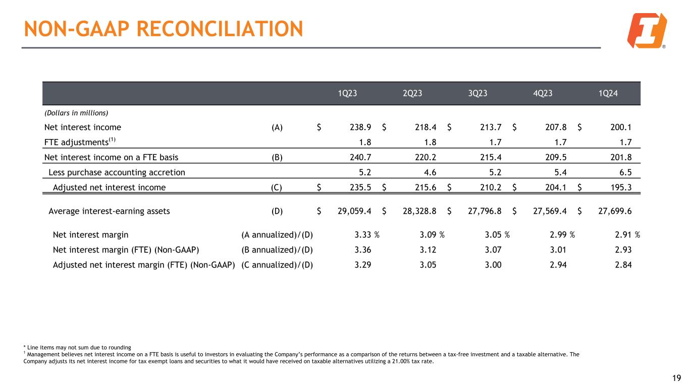 1Q23 2Q23 3Q23 4Q23 1Q24 (Dollars in millions) Total common stockholders' equity (GAAP) (A) $ 3,160.3 $ 3,121.2 $ 3,085.5 $ 3,227.5 $ 3,209.7 Less goodwill and other intangible assets (excluding mortgage servicing rights) 1,221.9 1,218.0 1,214.1 1,210.3 1,206.6 Tangible common stockholders' equity (Non-GAAP) (B) $ 1,938.4 $ 1,903.2 $ 1,871.4 $ 2,017.2 $ 2,003.1 Total assets (GAAP) $ 31,637.7 $ 30,976.3 $ 30,540.8 $ 30,671.2 $ 30,144.8 Less goodwill and other intangible assets (excluding mortgage servicing rights) 1,221.9 1,218.0 1,214.1 1,210.3 1,206.6 Tangible assets (Non-GAAP) (C) $ 30,415.8 $ 29,758.3 $ 29,326.7 $ 29,460.9 $ 28,938.2 Common shares outstanding (L) 104,382 105,021 105,011 103,942 104,572 Book value per common share (GAAP) (A) / (L) $ 30.28 $ 29.72 $ 29.38 $ 31.05 $ 30.69 Tangible book value per common share (Non-GAAP) (B) / (L) 18.57 18.12 17.82 19.41 19.16 Tangible common stockholders' equity to tangible assets (Non-GAAP) (B) / (C) 6.37 % 6.40 % 6.38 % 6.85 % 6.92 % NON-GAAP RECONCILIATION 18 * Line items may not sum due to rounding