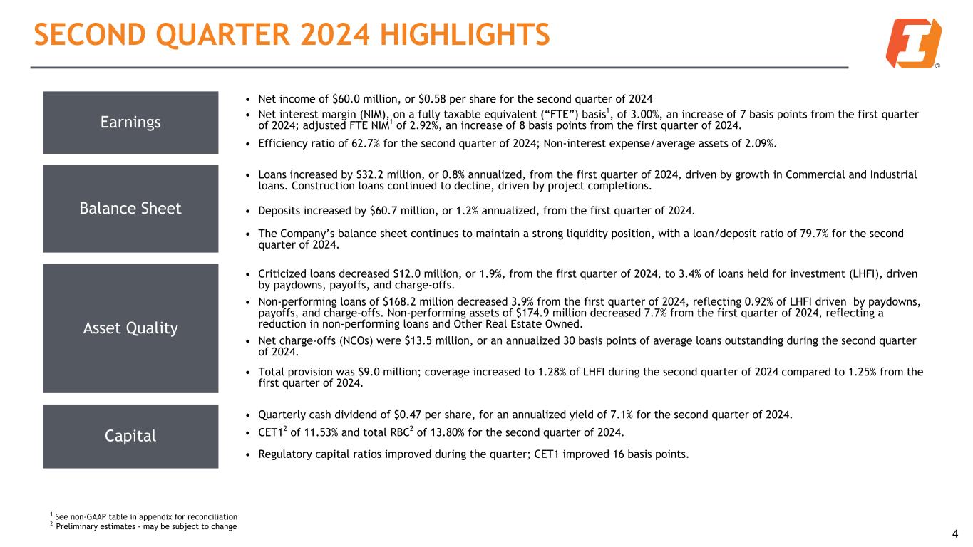 Earnings • Net income of $60.0 million, or $0.58 per share for the second quarter of 2024 • Net interest margin (NIM), on a fully taxable equivalent (“FTE”) basis1, of 3.00%, an increase of 7 basis points from the first quarter of 2024; adjusted FTE NIM1 of 2.92%, an increase of 8 basis points from the first quarter of 2024. • Efficiency ratio of 62.7% for the second quarter of 2024; Non-interest expense/average assets of 2.09%. Balance Sheet • Loans increased by $32.2 million, or 0.8% annualized, from the first quarter of 2024, driven by growth in Commercial and Industrial loans. Construction loans continued to decline, driven by project completions. • Deposits increased by $60.7 million, or 1.2% annualized, from the first quarter of 2024. • The Company’s balance sheet continues to maintain a strong liquidity position, with a loan/deposit ratio of 79.7% for the second quarter of 2024. Asset Quality • Criticized loans decreased $12.0 million, or 1.9%, from the first quarter of 2024, to 3.4% of loans held for investment (LHFI), driven by paydowns, payoffs, and charge-offs. • Non-performing loans of $168.2 million decreased 3.9% from the first quarter of 2024, reflecting 0.92% of LHFI driven by paydowns, payoffs, and charge-offs. Non-performing assets of $174.9 million decreased 7.7% from the first quarter of 2024, reflecting a reduction in non-performing loans and Other Real Estate Owned. • Net charge-offs (NCOs) were $13.5 million, or an annualized 30 basis points of average loans outstanding during the second quarter of 2024. • Total provision was $9.0 million; coverage increased to 1.28% of LHFI during the second quarter of 2024 compared to 1.25% from the first quarter of 2024. Capital • Quarterly cash dividend of $0.47 per share, for an annualized yield of 7.1% for the second quarter of 2024. • CET12 of 11.53% and total RBC2 of 13.80% for the second quarter of 2024. • Regulatory capital ratios improved during the quarter; CET1 improved 16 basis points. SECOND QUARTER 2024 HIGHLIGHTS 4 1 See non-GAAP table in appendix for reconciliation 2 Preliminary estimates - may be subject to change