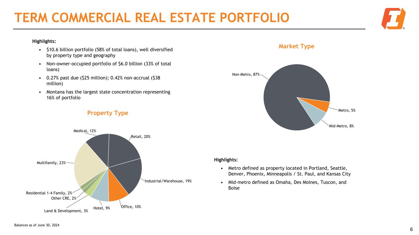 DIVERSIFIED LOAN PORTFOLIO Loans Held for Investment Commercial RE, 50% Construction RE, 8% Residential RE, 12% Agriculture RE, 4% Consumer, 5%Commercial, 17% Agriculture, 4% Loans by Geography MT, 19% WY, 7% ID, 7% WA, 9% OR, 10%NE, 7% SD, 12% ND, 2% IA, 10% KS, 2% AZ, 6% CO, 8% Other, 1% Revolving Commitments ($B) $3.1 $3.1 $3.0 $2.9 $2.7 37.1% 36.8% 38.5% 38.6% 41.3% Unfunded Funded 2Q23 3Q23 4Q23 1Q24 2Q24 5 Loan Highlights: • Loans increased $32.2 million during the second quarter of 2024 due mostly to increases in Commercial loans driven by both new production and increased line utilization, partially offset by a decline in Construction loans, driven by project completions. • Commercial real estate balances are 33.6% owner-occupied as-of the second quarter of 2024. $18.2B Balances as of June 30, 2024
