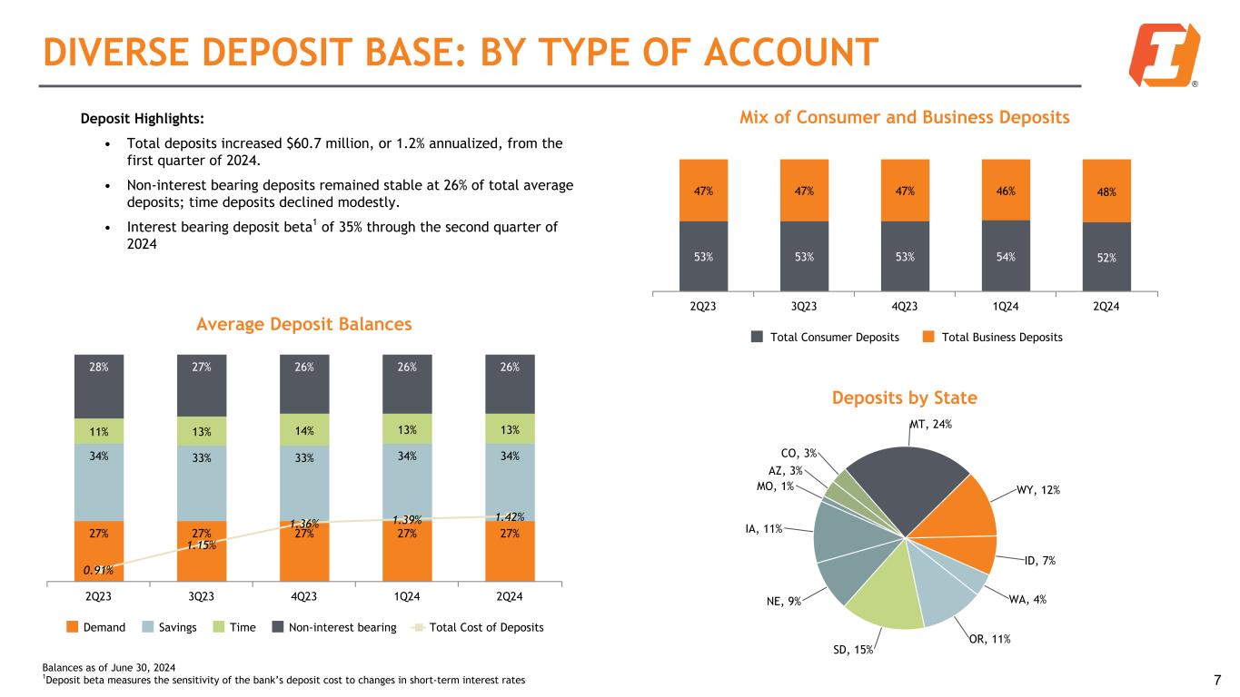 TERM COMMERCIAL REAL ESTATE PORTFOLIO Property Type Multifamily, 23% Medical, 12% Retail, 20% Industrial/Warehouse, 19% Office, 10%Hotel, 9% Land & Development, 3% Other CRE, 2% Residential 1-4 Family, 2% Market Type Metro, 5% Mid-Metro, 8% Non-Metro, 87% 6 Highlights: • $10.6 billion portfolio (58% of total loans), well diversified by property type and geography • Non-owner-occupied portfolio of $6.0 billion (33% of total loans) • 0.27% past due ($25 million); 0.42% non-accrual ($38 million) • Montana has the largest state concentration representing 16% of portfolio Balances as of June 30, 2024 Highlights: • Metro defined as property located in Portland, Seattle, Denver, Phoenix, Minneapolis / St. Paul, and Kansas City • Mid-metro defined as Omaha, Des Moines, Tuscon, and Boise