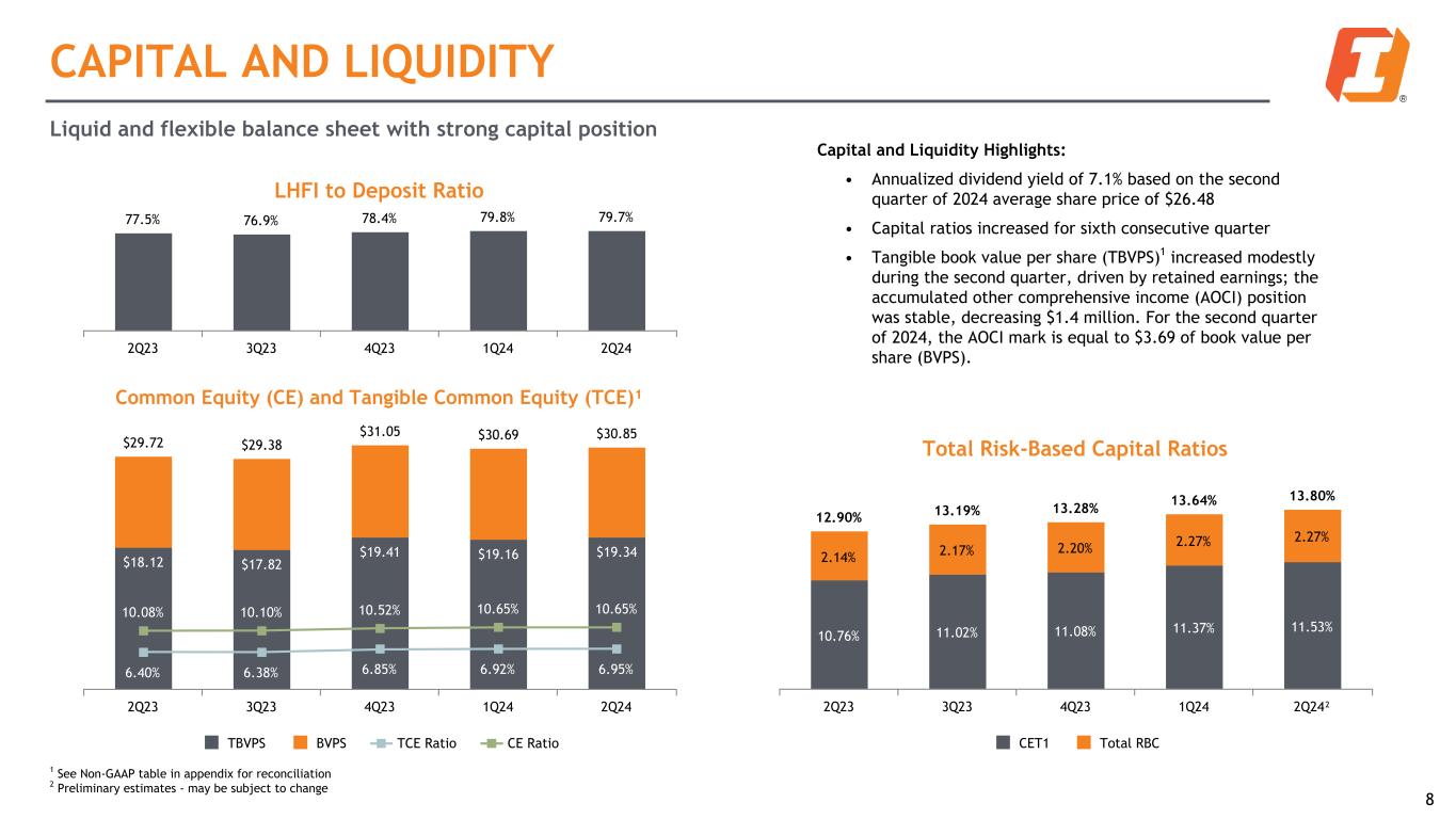 Deposits by State MT, 24% WY, 12% ID, 7% WA, 4% OR, 11% SD, 15% NE, 9% IA, 11% MO, 1% AZ, 3% CO, 3% Mix of Consumer and Business Deposits 53% 53% 53% 54% 52% 47% 47% 47% 46% 48% Total Consumer Deposits Total Business Deposits 2Q23 3Q23 4Q23 1Q24 2Q24 7 Average Deposit Balances 27% 27% 27% 27% 27% 34% 33% 33% 34% 34% 11% 13% 14% 13% 13% 28% 27% 26% 26% 26% 0.91% 1.15% 1.36% 1.39% 1.42% Demand Savings Time Non-interest bearing Total Cost of Deposits 2Q23 3Q23 4Q23 1Q24 2Q24 DIVERSE DEPOSIT BASE: BY TYPE OF ACCOUNT Balances as of June 30, 2024 1Deposit beta measures the sensitivity of the bank’s deposit cost to changes in short-term interest rates Deposit Highlights: • Total deposits increased $60.7 million, or 1.2% annualized, from the first quarter of 2024. • Non-interest bearing deposits remained stable at 26% of total average deposits; time deposits declined modestly. • Interest bearing deposit beta1 of 35% through the second quarter of 2024