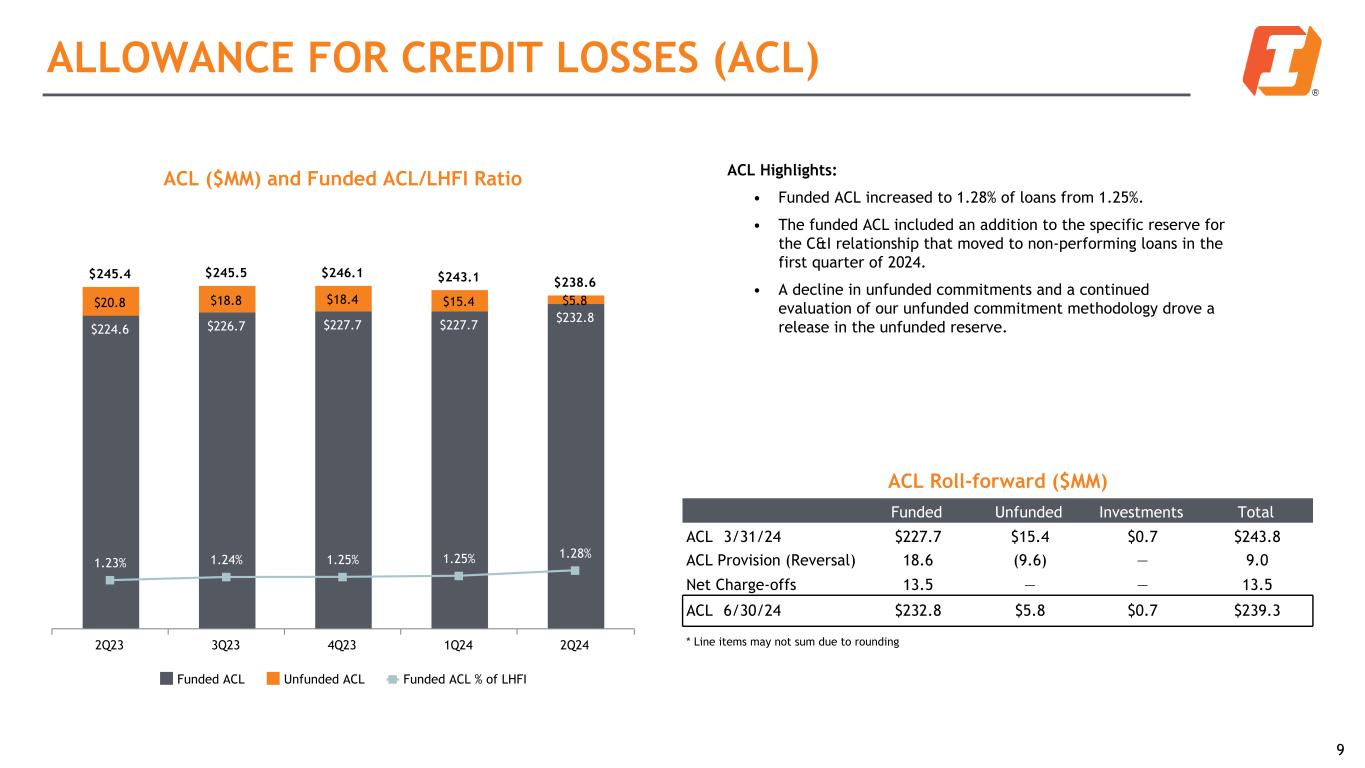 Total Risk-Based Capital Ratios 12.90% 13.19% 13.28% 13.64% 13.80% 10.76% 11.02% 11.08% 11.37% 11.53% 2.14% 2.17% 2.20% 2.27% 2.27% CET1 Total RBC 2Q23 3Q23 4Q23 1Q24 2Q24² CAPITAL AND LIQUIDITY Liquid and flexible balance sheet with strong capital position Common Equity (CE) and Tangible Common Equity (TCE)¹ $29.72 $29.38 $31.05 $30.69 $30.85 $18.12 $17.82 $19.41 $19.16 $19.34 6.40% 6.38% 6.85% 6.92% 6.95% 10.08% 10.10% 10.52% 10.65% 10.65% TBVPS BVPS TCE Ratio CE Ratio 2Q23 3Q23 4Q23 1Q24 2Q24 8 LHFI to Deposit Ratio 77.5% 76.9% 78.4% 79.8% 79.7% 2Q23 3Q23 4Q23 1Q24 2Q24 1 See Non-GAAP table in appendix for reconciliation 2 Preliminary estimates - may be subject to change Capital and Liquidity Highlights: • Annualized dividend yield of 7.1% based on the second quarter of 2024 average share price of $26.48 • Capital ratios increased for sixth consecutive quarter • Tangible book value per share (TBVPS)1 increased modestly during the second quarter, driven by retained earnings; the accumulated other comprehensive income (AOCI) position was stable, decreasing $1.4 million. For the second quarter of 2024, the AOCI mark is equal to $3.69 of book value per share (BVPS).