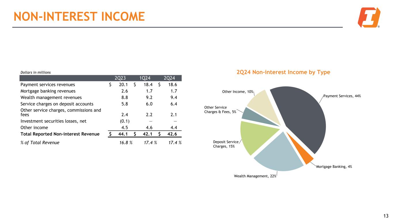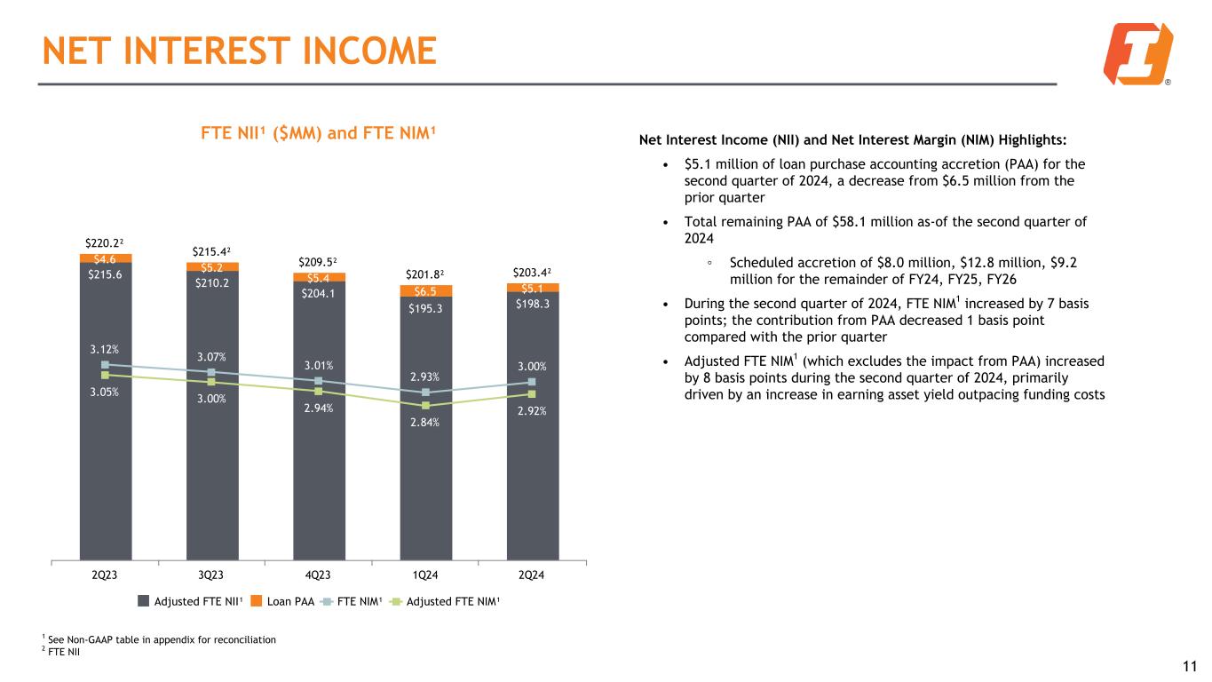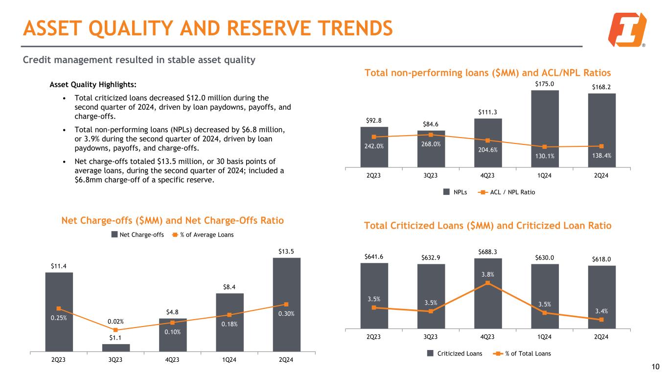 Asset Quality Highlights: • Total criticized loans decreased $12.0 million during the second quarter of 2024, driven by loan paydowns, payoffs, and charge-offs. • Total non-performing loans (NPLs) decreased by $6.8 million, or 3.9% during the second quarter of 2024, driven by loan paydowns, payoffs, and charge-offs. • Net charge-offs totaled $13.5 million, or 30 basis points of average loans, during the second quarter of 2024; included a $6.8mm charge-off of a specific reserve. ASSET QUALITY AND RESERVE TRENDS Net Charge-offs ($MM) and Net Charge-Offs Ratio $11.4 $1.1 $4.8 $8.4 $13.5 0.25% 0.02% 0.10% 0.18% 0.30% Net Charge-offs % of Average Loans 2Q23 3Q23 4Q23 1Q24 2Q24 Credit management resulted in stable asset quality Total non-performing loans ($MM) and ACL/NPL Ratios $92.8 $84.6 $111.3 $175.0 $168.2 242.0% 268.0% 204.6% 130.1% 138.4% NPLs ACL / NPL Ratio 2Q23 3Q23 4Q23 1Q24 2Q24 Total Criticized Loans ($MM) and Criticized Loan Ratio $641.6 $632.9 $688.3 $630.0 $618.0 3.5% 3.5% 3.8% 3.5% 3.4% Criticized Loans % of Total Loans 2Q23 3Q23 4Q23 1Q24 2Q24 10