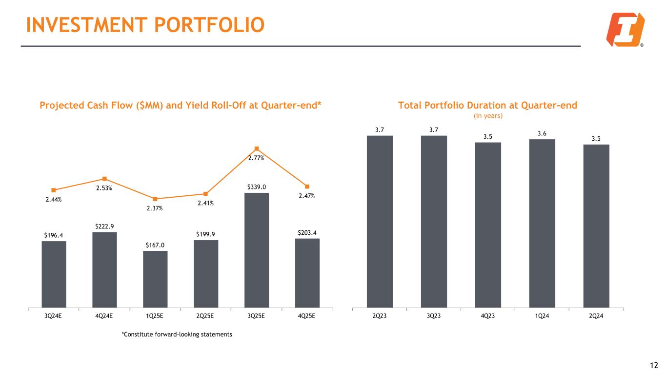 INVESTMENT PORTFOLIO 12 Total Portfolio Duration at Quarter-end 3.7 3.7 3.5 3.6 3.5 2Q23 3Q23 4Q23 1Q24 2Q24 (in years) Projected Cash Flow ($MM) and Yield Roll-Off at Quarter-end* $196.4 $222.9 $167.0 $199.9 $339.0 $203.4 2.44% 2.53% 2.37% 2.41% 2.77% 2.47% 3Q24E 4Q24E 1Q25E 2Q25E 3Q25E 4Q25E *Constitute forward-looking statements