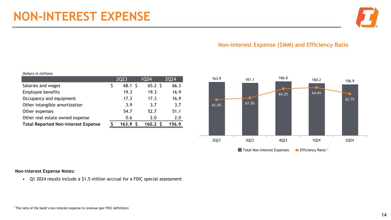 13 2Q24 Non-interest Income by Type Payment Services, 44% Mortgage Banking, 4% Wealth Management, 22% Deposit Service Charges, 15% Other Service Charges & Fees, 5% Other Income, 10% Dollars in millions 2Q23 1Q24 2Q24 Payment services revenues $ 20.1 $ 18.4 $ 18.6 Mortgage banking revenues 2.6 1.7 1.7 Wealth management revenues 8.8 9.2 9.4 Service charges on deposit accounts 5.8 6.0 6.4 Other service charges, commissions and fees 2.4 2.2 2.1 Investment securities losses, net (0.1) — — Other income 4.5 4.6 4.4 Total Reported Non-interest Revenue $ 44.1 $ 42.1 $ 42.6 % of Total Revenue 16.8 % 17.4 % 17.4 % NON-INTEREST INCOME