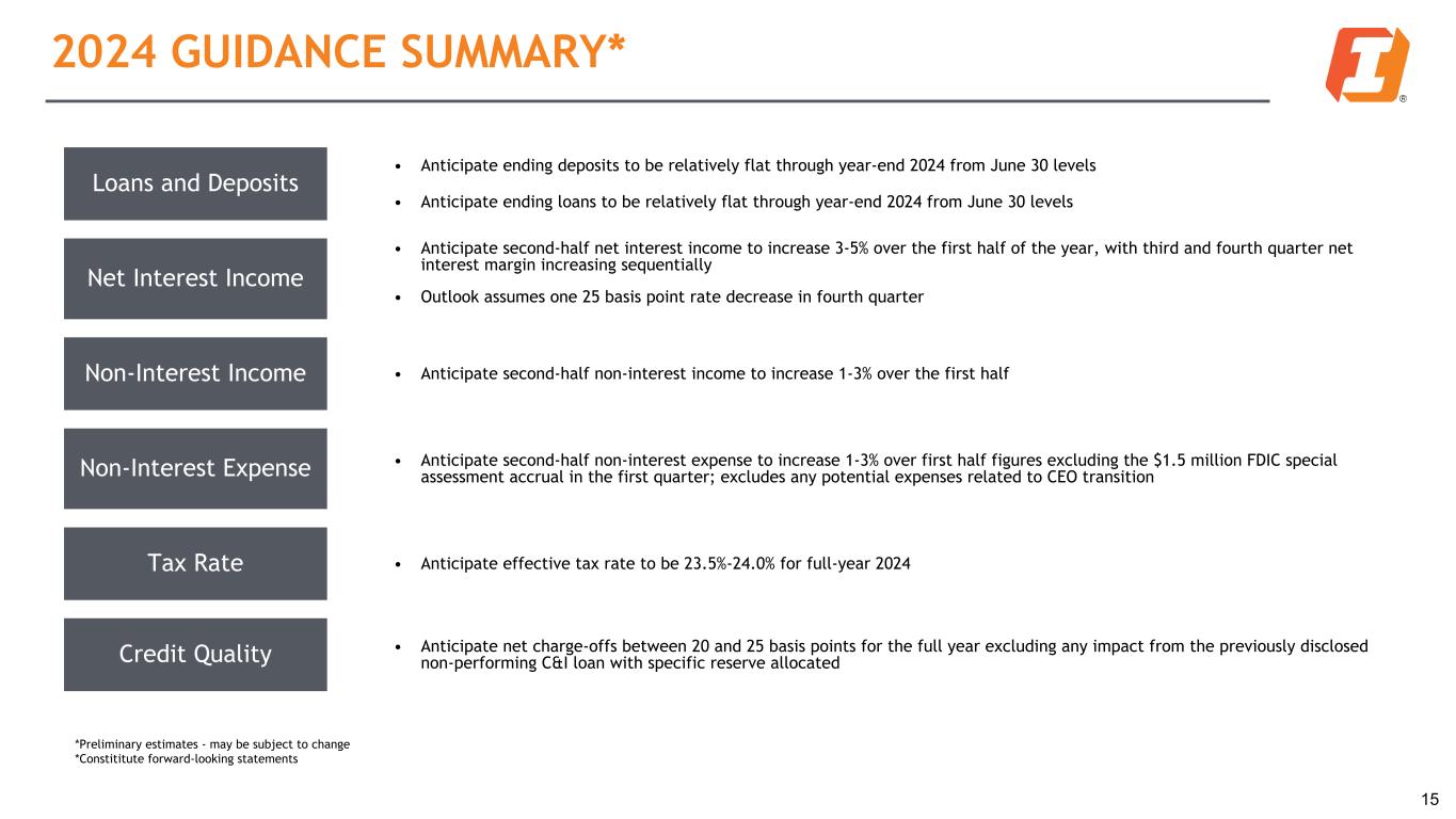 NON-INTEREST EXPENSE 14 Dollars in millions 2Q23 1Q24 2Q24 Salaries and wages $ 68.1 $ 65.2 $ 66.3 Employee benefits 19.3 19.3 16.9 Occupancy and equipment 17.3 17.3 16.9 Other intangible amortization 3.9 3.7 3.7 Other expenses 54.7 52.7 51.1 Other real estate owned expense 0.6 2.0 2.0 Total Reported Non-interest Expense $ 163.9 $ 160.2 $ 156.9 Non-interest Expense ($MM) and Efficiency Ratio 163.9 161.1 166.0 160.2 156.9 61.0% 61.5% 64.2% 64.6% 62.7% Total Non-interest Expenses Efficiency Ratio ¹ 2Q23 3Q23 4Q23 1Q24 2Q24 1 The ratio of the bank’s non-interest expense to revenue (per FDIC definition) Non-interest Expense Notes: • Q1 2024 results include a $1.5 million accrual for a FDIC special assessment
