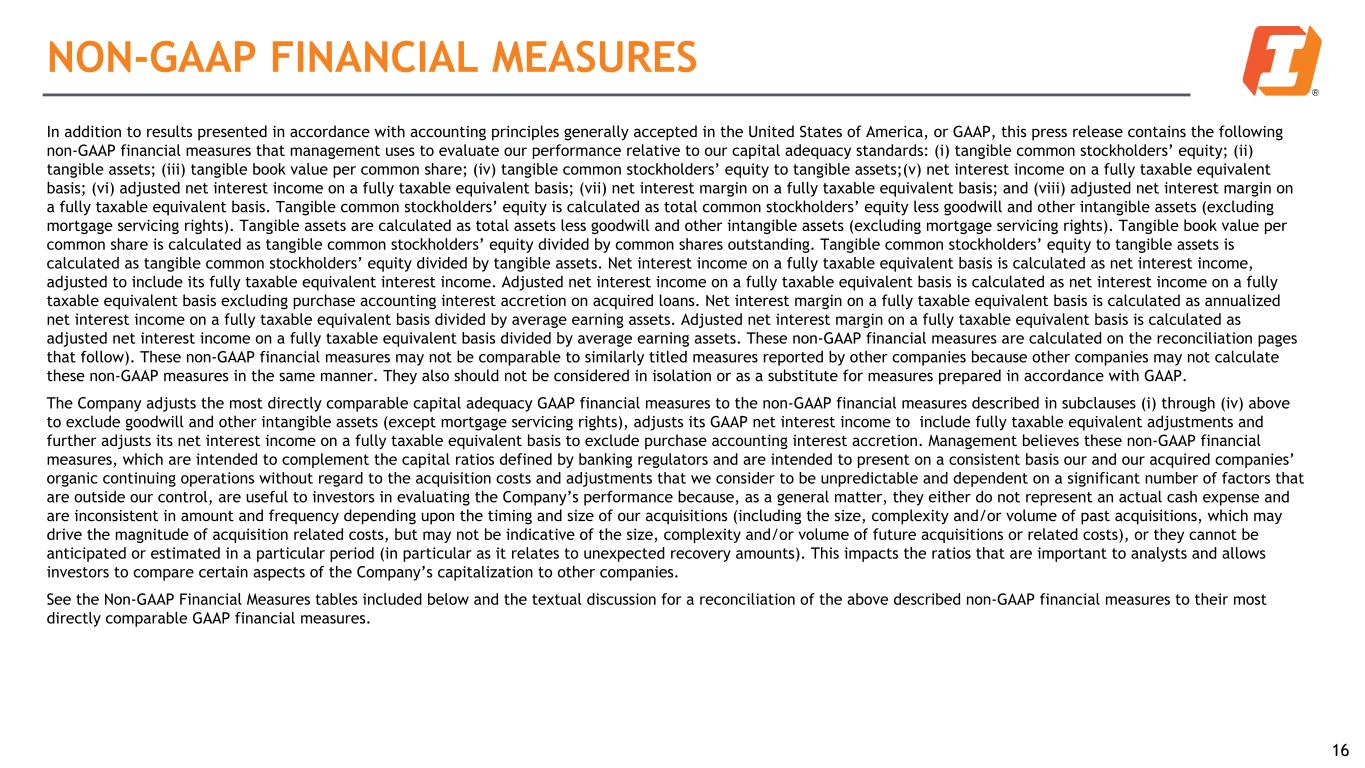 NON-GAAP FINANCIAL MEASURES 16 In addition to results presented in accordance with accounting principles generally accepted in the United States of America, or GAAP, this press release contains the following non-GAAP financial measures that management uses to evaluate our performance relative to our capital adequacy standards: (i) tangible common stockholders’ equity; (ii) tangible assets; (iii) tangible book value per common share; (iv) tangible common stockholders’ equity to tangible assets;(v) net interest income on a fully taxable equivalent basis; (vi) adjusted net interest income on a fully taxable equivalent basis; (vii) net interest margin on a fully taxable equivalent basis; and (viii) adjusted net interest margin on a fully taxable equivalent basis. Tangible common stockholders’ equity is calculated as total common stockholders’ equity less goodwill and other intangible assets (excluding mortgage servicing rights). Tangible assets are calculated as total assets less goodwill and other intangible assets (excluding mortgage servicing rights). Tangible book value per common share is calculated as tangible common stockholders’ equity divided by common shares outstanding. Tangible common stockholders’ equity to tangible assets is calculated as tangible common stockholders’ equity divided by tangible assets. Net interest income on a fully taxable equivalent basis is calculated as net interest income, adjusted to include its fully taxable equivalent interest income. Adjusted net interest income on a fully taxable equivalent basis is calculated as net interest income on a fully taxable equivalent basis excluding purchase accounting interest accretion on acquired loans. Net interest margin on a fully taxable equivalent basis is calculated as annualized net interest income on a fully taxable equivalent basis divided by average earning assets. Adjusted net interest margin on a fully taxable equivalent basis is calculated as adjusted net interest income on a fully taxable equivalent basis divided by average earning assets. These non-GAAP financial measures are calculated on the reconciliation pages that follow). These non-GAAP financial measures may not be comparable to similarly titled measures reported by other companies because other companies may not calculate these non-GAAP measures in the same manner. They also should not be considered in isolation or as a substitute for measures prepared in accordance with GAAP. The Company adjusts the most directly comparable capital adequacy GAAP financial measures to the non-GAAP financial measures described in subclauses (i) through (iv) above to exclude goodwill and other intangible assets (except mortgage servicing rights), adjusts its GAAP net interest income to include fully taxable equivalent adjustments and further adjusts its net interest income on a fully taxable equivalent basis to exclude purchase accounting interest accretion. Management believes these non-GAAP financial measures, which are intended to complement the capital ratios defined by banking regulators and are intended to present on a consistent basis our and our acquired companies’ organic continuing operations without regard to the acquisition costs and adjustments that we consider to be unpredictable and dependent on a significant number of factors that are outside our control, are useful to investors in evaluating the Company’s performance because, as a general matter, they either do not represent an actual cash expense and are inconsistent in amount and frequency depending upon the timing and size of our acquisitions (including the size, complexity and/or volume of past acquisitions, which may drive the magnitude of acquisition related costs, but may not be indicative of the size, complexity and/or volume of future acquisitions or related costs), or they cannot be anticipated or estimated in a particular period (in particular as it relates to unexpected recovery amounts). This impacts the ratios that are important to analysts and allows investors to compare certain aspects of the Company’s capitalization to other companies. See the Non-GAAP Financial Measures tables included below and the textual discussion for a reconciliation of the above described non-GAAP financial measures to their most directly comparable GAAP financial measures.