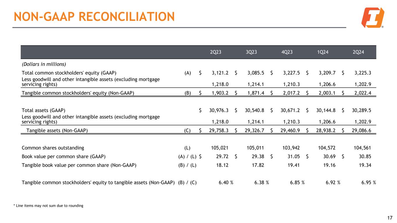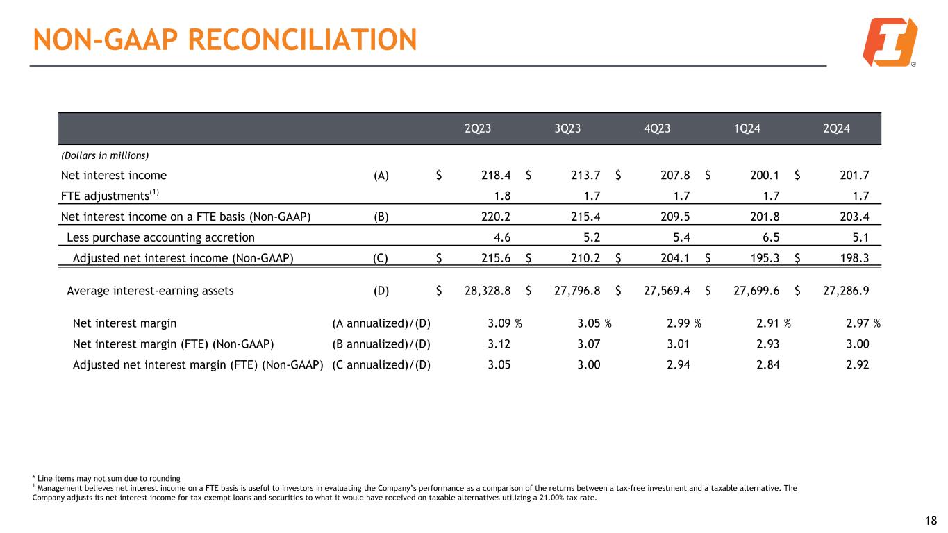 2Q23 3Q23 4Q23 1Q24 2Q24 (Dollars in millions) Total common stockholders' equity (GAAP) (A) $ 3,121.2 $ 3,085.5 $ 3,227.5 $ 3,209.7 $ 3,225.3 Less goodwill and other intangible assets (excluding mortgage servicing rights) 1,218.0 1,214.1 1,210.3 1,206.6 1,202.9 Tangible common stockholders' equity (Non-GAAP) (B) $ 1,903.2 $ 1,871.4 $ 2,017.2 $ 2,003.1 $ 2,022.4 Total assets (GAAP) $ 30,976.3 $ 30,540.8 $ 30,671.2 $ 30,144.8 $ 30,289.5 Less goodwill and other intangible assets (excluding mortgage servicing rights) 1,218.0 1,214.1 1,210.3 1,206.6 1,202.9 Tangible assets (Non-GAAP) (C) $ 29,758.3 $ 29,326.7 $ 29,460.9 $ 28,938.2 $ 29,086.6 Common shares outstanding (L) 105,021 105,011 103,942 104,572 104,561 Book value per common share (GAAP) (A) / (L) $ 29.72 $ 29.38 $ 31.05 $ 30.69 $ 30.85 Tangible book value per common share (Non-GAAP) (B) / (L) 18.12 17.82 19.41 19.16 19.34 Tangible common stockholders' equity to tangible assets (Non-GAAP) (B) / (C) 6.40 % 6.38 % 6.85 % 6.92 % 6.95 % NON-GAAP RECONCILIATION 17 * Line items may not sum due to rounding