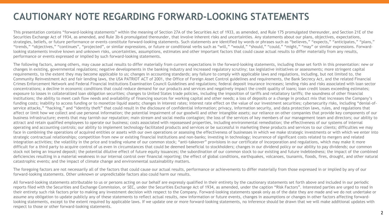 CAUTIONARY NOTE REGARDING FORWARD-LOOKING STATEMENTS This presentation contains “forward-looking statements” within the meaning of Section 27A of the Securities Act of 1933, as amended, and Rule 175 promulgated thereunder, and Section 21E of the Securities Exchange Act of 1934, as amended, and Rule 3b-6 promulgated thereunder, that involve inherent risks and uncertainties. Any statements about our plans, objectives, expectations, strategies, beliefs, or future performance or events constitute forward-looking statements. Such statements are identified by words or phrases such as “believes,” “expects,” “anticipates,” “plans,” “trends,” “objectives,” “continues”, “projected”, or similar expressions, or future or conditional verbs such as “will,” “would,” “should,” “could,” “might,” “may” or similar expressions. Forward- looking statements involve known and unknown risks, uncertainties, assumptions, estimates and other important factors that could cause actual results to differ materially from any results, performance or events expressed or implied by such forward-looking statements. The following factors, among others, may cause actual results to differ materially from current expectations in the forward-looking statements, including those set forth in this presentation: new or changes in existing, governmental regulations; negative developments in the banking industry and increased regulatory scrutiny; tax legislative initiatives or assessments; more stringent capital requirements, to the extent they may become applicable to us; changes in accounting standards; any failure to comply with applicable laws and regulations, including, but not limited to, the Community Reinvestment Act and fair lending laws, the USA PATRIOT ACT of 2001, the Office of Foreign Asset Control guidelines and requirements, the Bank Secrecy Act, and the related Financial Crimes Enforcement Network and Federal Financial Institutions Examination Council Guidelines and regulations; federal deposit insurance increases; lending risks and risks associated with loan sector concentrations; a decline in economic conditions that could reduce demand for our products and services and negatively impact the credit quality of loans; loan credit losses exceeding estimates; exposure to losses in collateralized loan obligation securities; changes to United States trade policies, including the imposition of tariffs and retaliatory tariffs; the soundness of other financial institutions; the ability to meet cash flow needs and availability of financing sources for working capital and other needs; a loss of deposits or a change in product mix that increases the Company’s funding costs; inability to access funding or to monetize liquid assets; changes in interest rates; interest rate effect on the value of our investment securities; cybersecurity risks, including “denial-of- service attacks,” “hacking,” and “identity theft” that could result in the disclosure of confidential information; privacy, information security, and data protection laws, rules, and regulations that affect or limit how we collect and use personal information; the potential impairment of our goodwill and other intangible assets; our reliance on other companies that provide key components of our business infrastructure; events that may tarnish our reputation; main stream and social media contagion; the loss of the services of key members of our management team and directors; our ability to attract and retain qualified employees to operate our business; costs associated with repossessed properties, including environmental remediation; the effectiveness of our systems of internal operating and accounting controls; our ability to implement technology-facilitated products and services or be successful in marketing these products and services to our clients; difficulties we may face in combining the operations of acquired entities or assets with our own operations or assessing the effectiveness of businesses in which we make strategic investments or with which we enter into strategic contractual relationships; competition from new or existing financial institutions and non-banks; investing in technology; incurrence of significant costs related to mergers and related integration activities; the volatility in the price and trading volume of our common stock; “anti-takeover” provisions in our certificate of incorporation and regulations, which may make it more difficult for a third party to acquire control of us even in circumstances that could be deemed beneficial to stockholders; changes in our dividend policy or our ability to pay dividends; our common stock not being an insured deposit; the potential dilutive effect of future equity issuances; the subordination of our common stock to our existing and future indebtedness; the impact of the combined deficiencies resulting in a material weakness in our internal control over financial reporting; the effect of global conditions, earthquakes, volcanoes, tsunamis, floods, fires, drought, and other natural catastrophic events; and the impact of climate change and environmental sustainability matters. The foregoing factors are not necessarily all of the factors that could cause our actual results, performance or achievements to differ materially from those expressed in or implied by any of our forward-looking statements. Other unknown or unpredictable factors also could harm our results. All forward-looking statements attributable to us or persons acting on our behalf are expressly qualified in their entirety by the cautionary statements set forth above and included in our periodic reports filed with the Securities and Exchange Commission, or SEC, under the Securities Exchange Act of 1934, as amended, under the caption “Risk Factors”. Interested parties are urged to read in their entirety such risk factors prior to making any investment decision with re