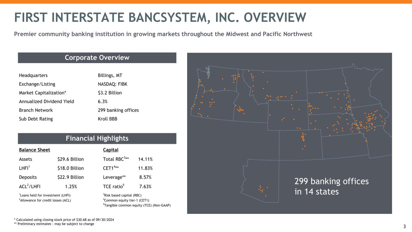 FIRST INTERSTATE BANCSYSTEM, INC. OVERVIEW Premier community banking institution in growing markets throughout the Midwest and Pacific Northwest Financial Highlights Balance Sheet Capital Assets $29.6 Billion Total RBC3** 14.11% LHFI1 $18.0 Billion CET14** 11.83% Deposits $22.9 Billion Leverage** 8.57% ACL2/LHFI 1.25% TCE ratio5 7.63% 1Loans held for investment (LHFI) 3Risk based capital (RBC) 2Allowance for credit losses (ACL) 4Common equity tier-1 (CET1) 5Tangible common equity (TCE) (Non-GAAP) Corporate Overview Headquarters Billings, MT Exchange/Listing NASDAQ: FIBK Market Capitalization* $3.2 Billion Annualized Dividend Yield 6.3% Branch Network 299 banking offices Sub Debt Rating Kroll BBB 3 299 banking offices in 14 states * Calculated using closing stock price of $30.68 as of 09/30/2024 ** Preliminary estimates - may be subject to change