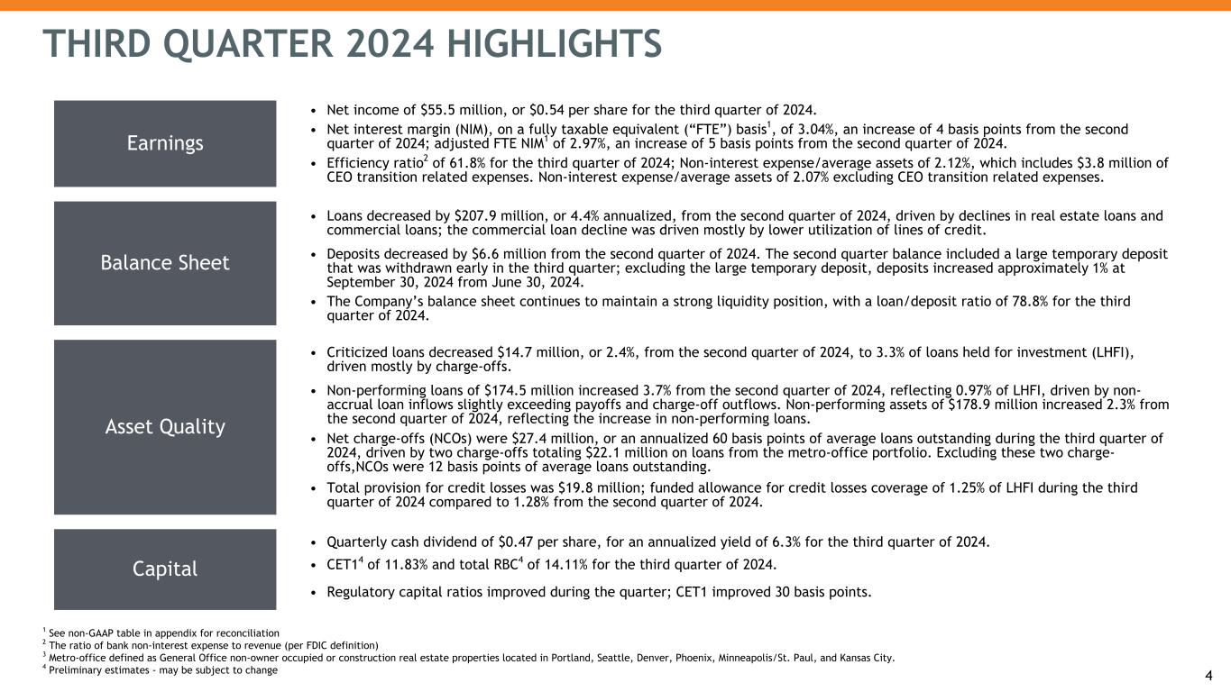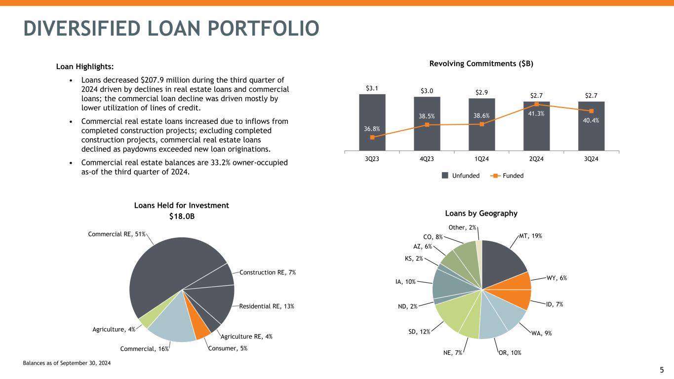 Earnings • Net income of $55.5 million, or $0.54 per share for the third quarter of 2024. • Net interest margin (NIM), on a fully taxable equivalent (“FTE”) basis1, of 3.04%, an increase of 4 basis points from the second quarter of 2024; adjusted FTE NIM1 of 2.97%, an increase of 5 basis points from the second quarter of 2024. • Efficiency ratio2 of 61.8% for the third quarter of 2024; Non-interest expense/average assets of 2.12%, which includes $3.8 million of CEO transition related expenses. Non-interest expense/average assets of 2.07% excluding CEO transition related expenses. Balance Sheet • Loans decreased by $207.9 million, or 4.4% annualized, from the second quarter of 2024, driven by declines in real estate loans and commercial loans; the commercial loan decline was driven mostly by lower utilization of lines of credit. • Deposits decreased by $6.6 million from the second quarter of 2024. The second quarter balance included a large temporary deposit that was withdrawn early in the third quarter; excluding the large temporary deposit, deposits increased approximately 1% at September 30, 2024 from June 30, 2024. • The Company’s balance sheet continues to maintain a strong liquidity position, with a loan/deposit ratio of 78.8% for the third quarter of 2024. Asset Quality • Criticized loans decreased $14.7 million, or 2.4%, from the second quarter of 2024, to 3.3% of loans held for investment (LHFI), driven mostly by charge-offs. • Non-performing loans of $174.5 million increased 3.7% from the second quarter of 2024, reflecting 0.97% of LHFI, driven by non- accrual loan inflows slightly exceeding payoffs and charge-off outflows. Non-performing assets of $178.9 million increased 2.3% from the second quarter of 2024, reflecting the increase in non-performing loans. • Net charge-offs (NCOs) were $27.4 million, or an annualized 60 basis points of average loans outstanding during the third quarter of 2024, driven by two charge-offs totaling $22.1 million on loans from the metro-office portfolio. Excluding these two charge- offs,NCOs were 12 basis points of average loans outstanding. • Total provision for credit losses was $19.8 million; funded allowance for credit losses coverage of 1.25% of LHFI during the third quarter of 2024 compared to 1.28% from the second quarter of 2024. Capital • Quarterly cash dividend of $0.47 per share, for an annualized yield of 6.3% for the third quarter of 2024. • CET14 of 11.83% and total RBC4 of 14.11% for the third quarter of 2024. • Regulatory capital ratios improved during the quarter; CET1 improved 30 basis points. THIRD QUARTER 2024 HIGHLIGHTS 4 1 See non-GAAP table in appendix for reconciliation 2 The ratio of bank non-interest expense to revenue (per FDIC definition) 3 Metro-office defined as General Office non-owner occupied or construction real estate properties located in Portland, Seattle, Denver, Phoenix, Minneapolis/St. Paul, and Kansas City. 4 Preliminary estimates - may be subject to change