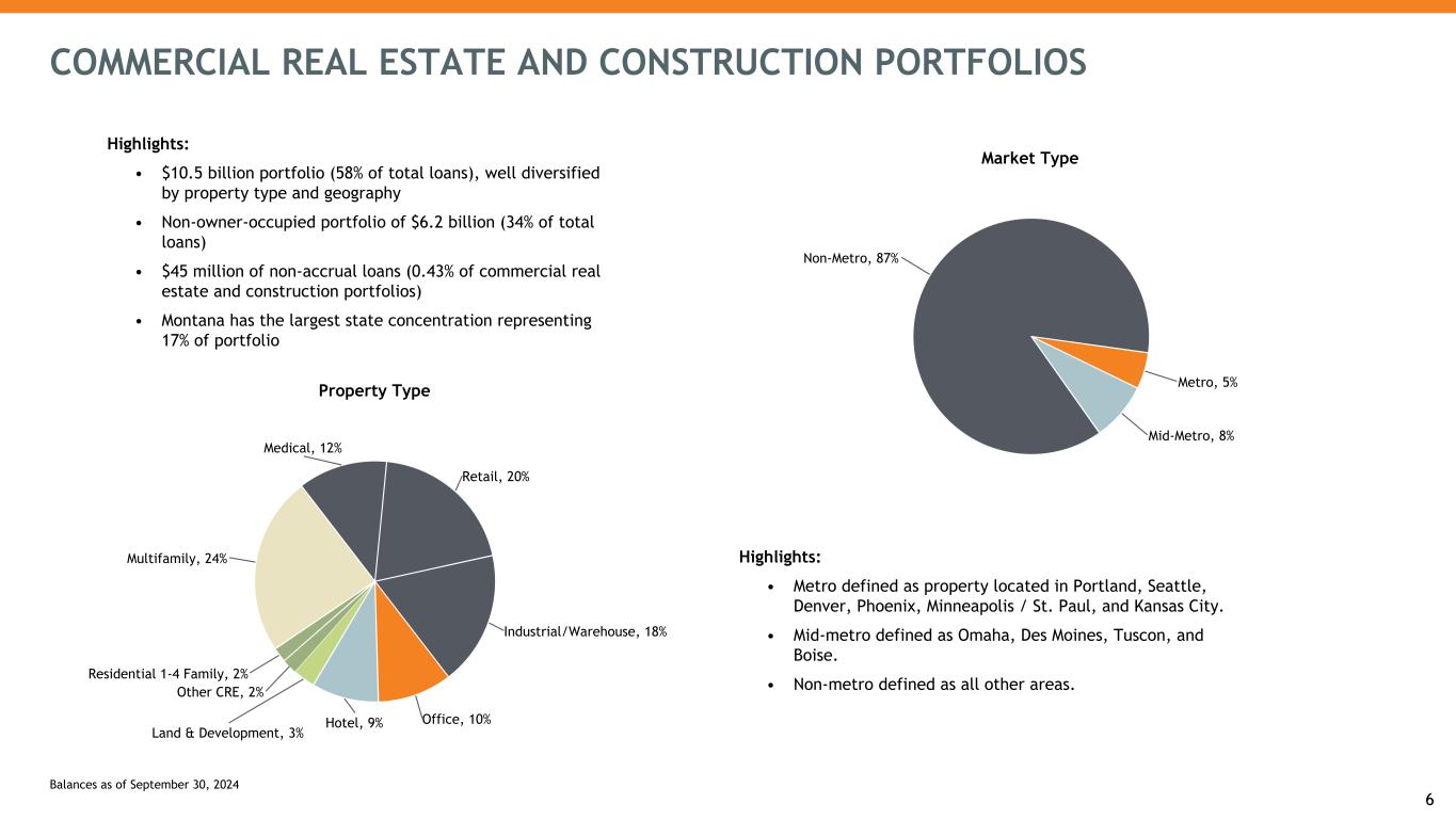 Loan Highlights: • Loans decreased $207.9 million during the third quarter of 2024 driven by declines in real estate loans and commercial loans; the commercial loan decline was driven mostly by lower utilization of lines of credit. • Commercial real estate loans increased due to inflows from completed construction projects; excluding completed construction projects, commercial real estate loans declined as paydowns exceeded new loan originations. • Commercial real estate balances are 33.2% owner-occupied as-of the third quarter of 2024. DIVERSIFIED LOAN PORTFOLIO Loans Held for Investment Commercial RE, 51% Construction RE, 7% Residential RE, 13% Agriculture RE, 4% Consumer, 5%Commercial, 16% Agriculture, 4% Loans by Geography MT, 19% WY, 6% ID, 7% WA, 9% OR, 10%NE, 7% SD, 12% ND, 2% IA, 10% KS, 2% AZ, 6% CO, 8% Other, 2% Revolving Commitments ($B) $3.1 $3.0 $2.9 $2.7 $2.7 36.8% 38.5% 38.6% 41.3% 40.4% Unfunded Funded 3Q23 4Q23 1Q24 2Q24 3Q24 5 $18.0B Balances as of September 30, 2024