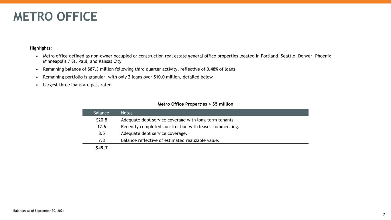 COMMERCIAL REAL ESTATE AND CONSTRUCTION PORTFOLIOS Property Type Multifamily, 24% Medical, 12% Retail, 20% Industrial/Warehouse, 18% Office, 10%Hotel, 9% Land & Development, 3% Other CRE, 2% Residential 1-4 Family, 2% Market Type Metro, 5% Mid-Metro, 8% Non-Metro, 87% 6 Highlights: • $10.5 billion portfolio (58% of total loans), well diversified by property type and geography • Non-owner-occupied portfolio of $6.2 billion (34% of total loans) • $45 million of non-accrual loans (0.43% of commercial real estate and construction portfolios) • Montana has the largest state concentration representing 17% of portfolio Balances as of September 30, 2024 Highlights: • Metro defined as property located in Portland, Seattle, Denver, Phoenix, Minneapolis / St. Paul, and Kansas City. • Mid-metro defined as Omaha, Des Moines, Tuscon, and Boise. • Non-metro defined as all other areas.