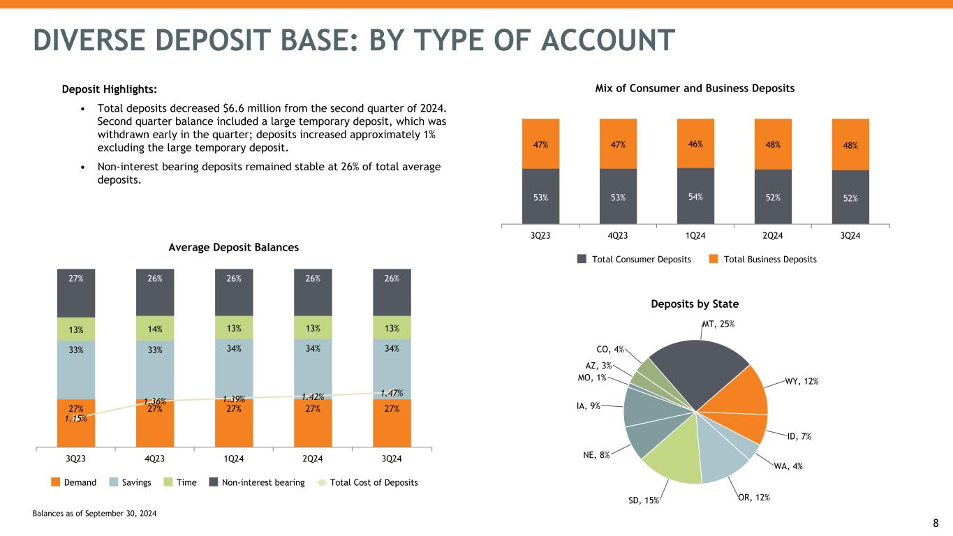 Deposits by State MT, 25% WY, 12% ID, 7% WA, 4% OR, 12%SD, 15% NE, 8% IA, 9% MO, 1% AZ, 3% CO, 4% Mix of Consumer and Business Deposits 53% 53% 54% 52% 52% 47% 47% 46% 48% 48% Total Consumer Deposits Total Business Deposits 3Q23 4Q23 1Q24 2Q24 3Q24 8 Average Deposit Balances 27% 27% 27% 27% 27% 33% 33% 34% 34% 34% 13% 14% 13% 13% 13% 27% 26% 26% 26% 26% 1.15% 1.36% 1.39% 1.42% 1.47% Demand Savings Time Non-interest bearing Total Cost of Deposits 3Q23 4Q23 1Q24 2Q24 3Q24 DIVERSE DEPOSIT BASE: BY TYPE OF ACCOUNT Balances as of September 30, 2024 Deposit Highlights: • Total deposits decreased $6.6 million from the second quarter of 2024. Second quarter balance included a large temporary deposit, which was withdrawn early in the quarter; deposits increased approximately 1% excluding the large temporary deposit. • Non-interest bearing deposits remained stable at 26% of total average deposits.