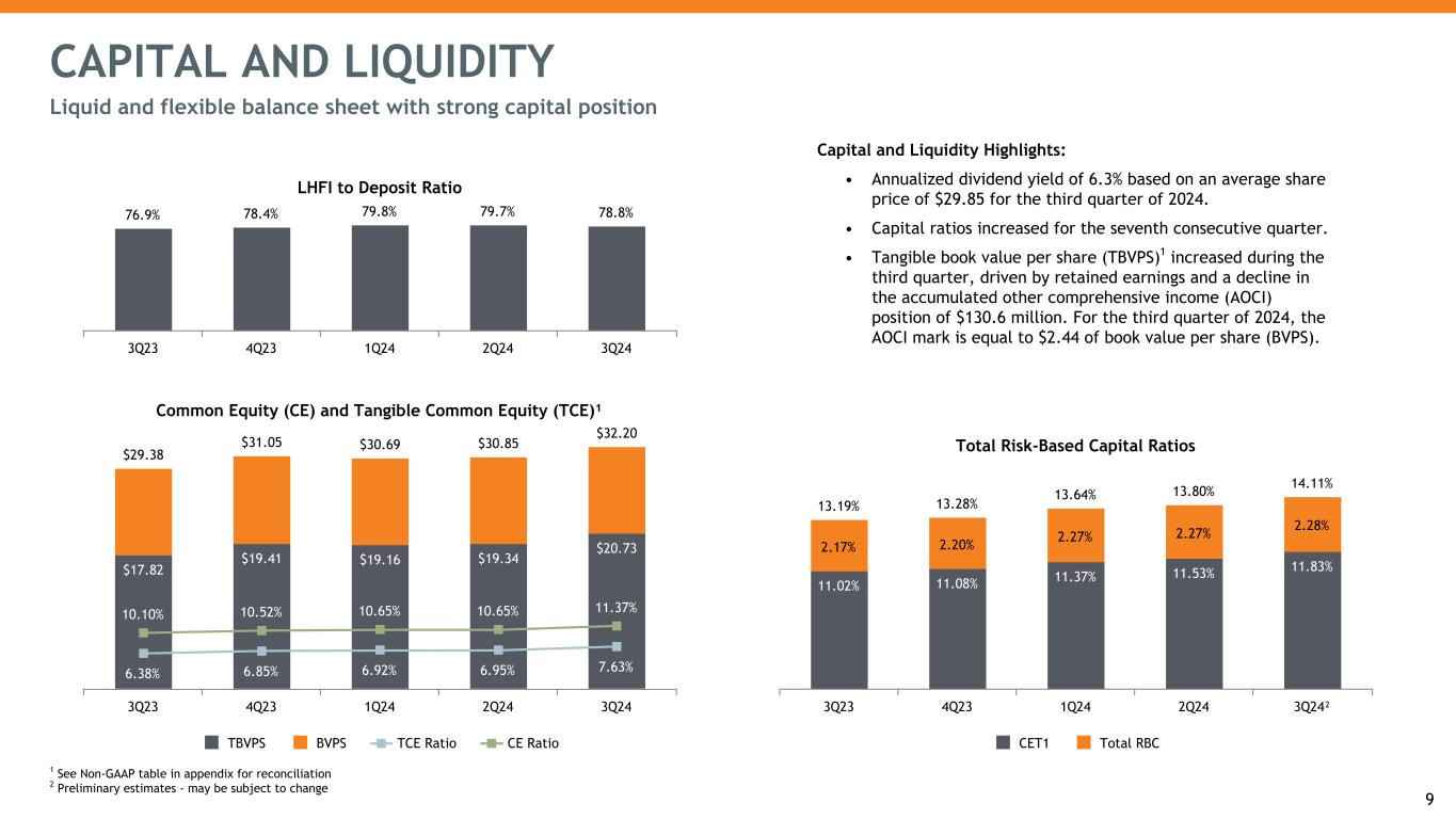 Total Risk-Based Capital Ratios 13.19% 13.28% 13.64% 13.80% 14.11% 11.02% 11.08% 11.37% 11.53% 11.83% 2.17% 2.20% 2.27% 2.27% 2.28% CET1 Total RBC 3Q23 4Q23 1Q24 2Q24 3Q24² CAPITAL AND LIQUIDITY Liquid and flexible balance sheet with strong capital position Common Equity (CE) and Tangible Common Equity (TCE)¹ $29.38 $31.05 $30.69 $30.85 $32.20 $17.82 $19.41 $19.16 $19.34 $20.73 6.38% 6.85% 6.92% 6.95% 7.63% 10.10% 10.52% 10.65% 10.65% 11.37% TBVPS BVPS TCE Ratio CE Ratio 3Q23 4Q23 1Q24 2Q24 3Q24 9 LHFI to Deposit Ratio 76.9% 78.4% 79.8% 79.7% 78.8% 3Q23 4Q23 1Q24 2Q24 3Q24 1 See Non-GAAP table in appendix for reconciliation 2 Preliminary estimates - may be subject to change Capital and Liquidity Highlights: • Annualized dividend yield of 6.3% based on an average share price of $29.85 for the third quarter of 2024. • Capital ratios increased for the seventh consecutive quarter. • Tangible book value per share (TBVPS)1 increased during the third quarter, driven by retained earnings and a decline in the accumulated other comprehensive income (AOCI) position of $130.6 million. For the third quarter of 2024, the AOCI mark is equal to $2.44 of book value per share (BVPS).