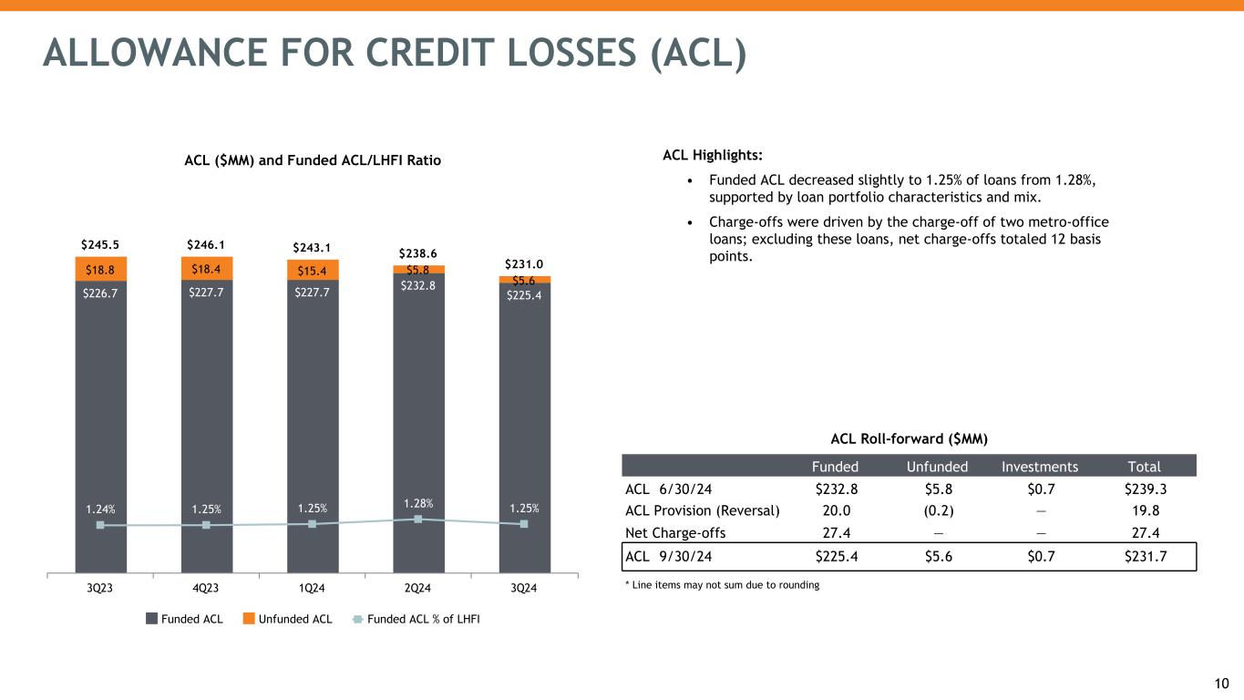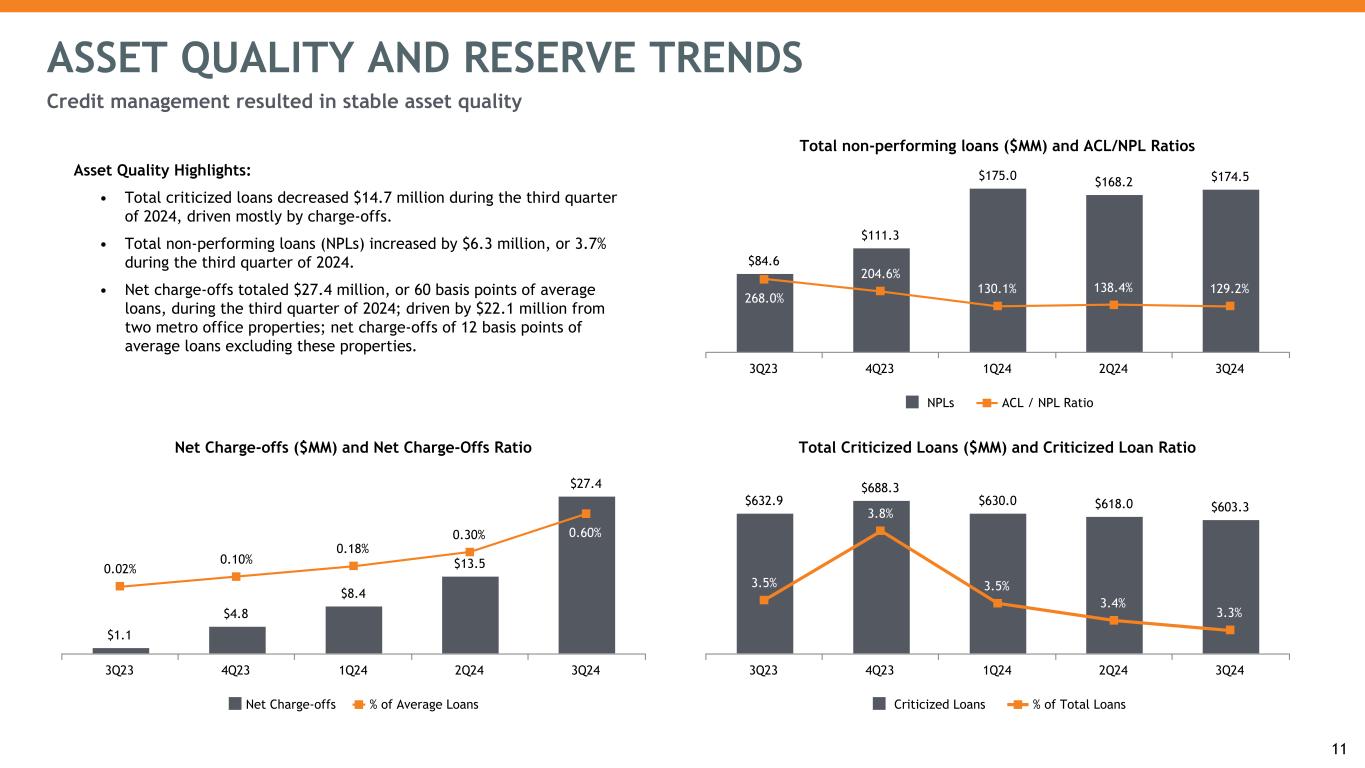 Asset Quality Highlights: • Total criticized loans decreased $14.7 million during the third quarter of 2024, driven mostly by charge-offs. • Total non-performing loans (NPLs) increased by $6.3 million, or 3.7% during the third quarter of 2024. • Net charge-offs totaled $27.4 million, or 60 basis points of average loans, during the third quarter of 2024; driven by $22.1 million from two metro office properties; net charge-offs of 12 basis points of average loans excluding these properties. ASSET QUALITY AND RESERVE TRENDS Net Charge-offs ($MM) and Net Charge-Offs Ratio $1.1 $4.8 $8.4 $13.5 $27.4 0.02% 0.10% 0.18% 0.30% 0.60% Net Charge-offs % of Average Loans 3Q23 4Q23 1Q24 2Q24 3Q24 Credit management resulted in stable asset quality Total non-performing loans ($MM) and ACL/NPL Ratios $84.6 $111.3 $175.0 $168.2 $174.5 268.0% 204.6% 130.1% 138.4% 129.2% NPLs ACL / NPL Ratio 3Q23 4Q23 1Q24 2Q24 3Q24 Total Criticized Loans ($MM) and Criticized Loan Ratio $632.9 $688.3 $630.0 $618.0 $603.3 3.5% 3.8% 3.5% 3.4% 3.3% Criticized Loans % of Total Loans 3Q23 4Q23 1Q24 2Q24 3Q24 11