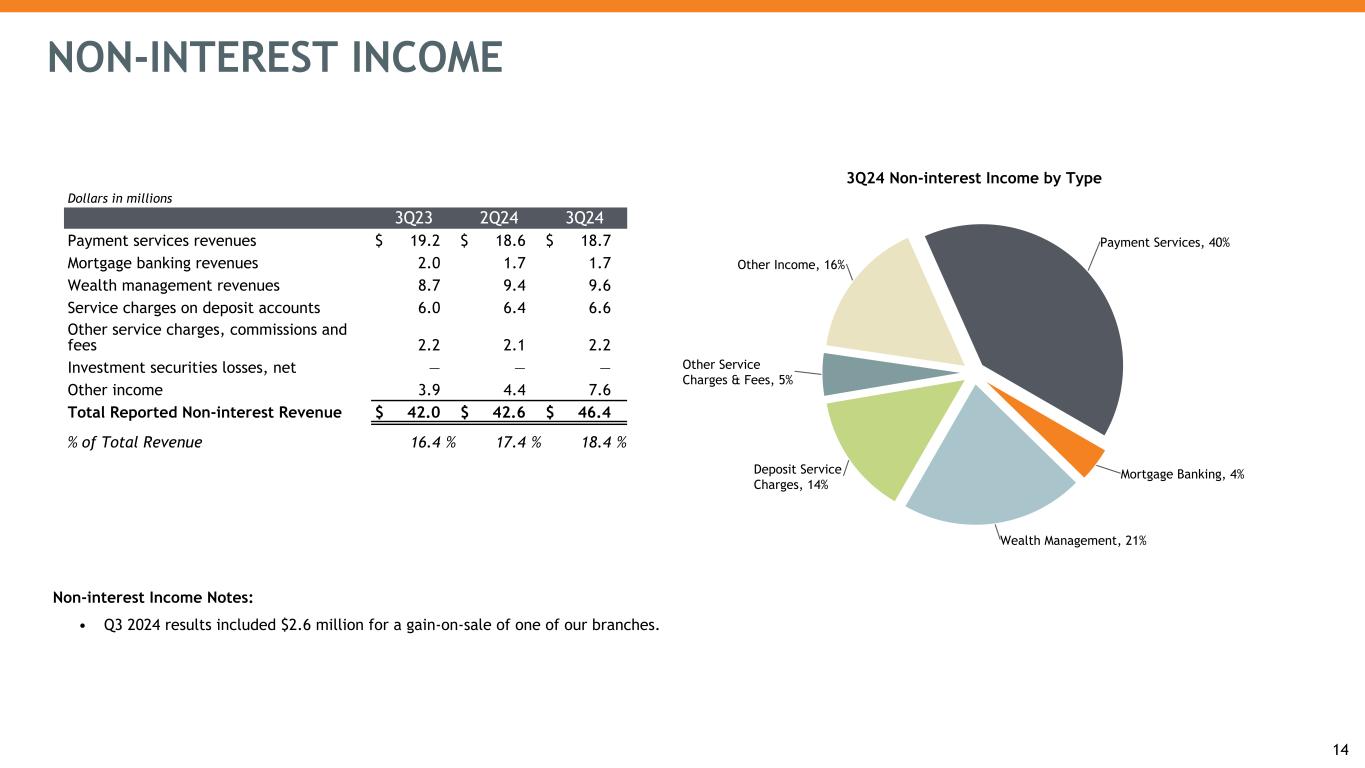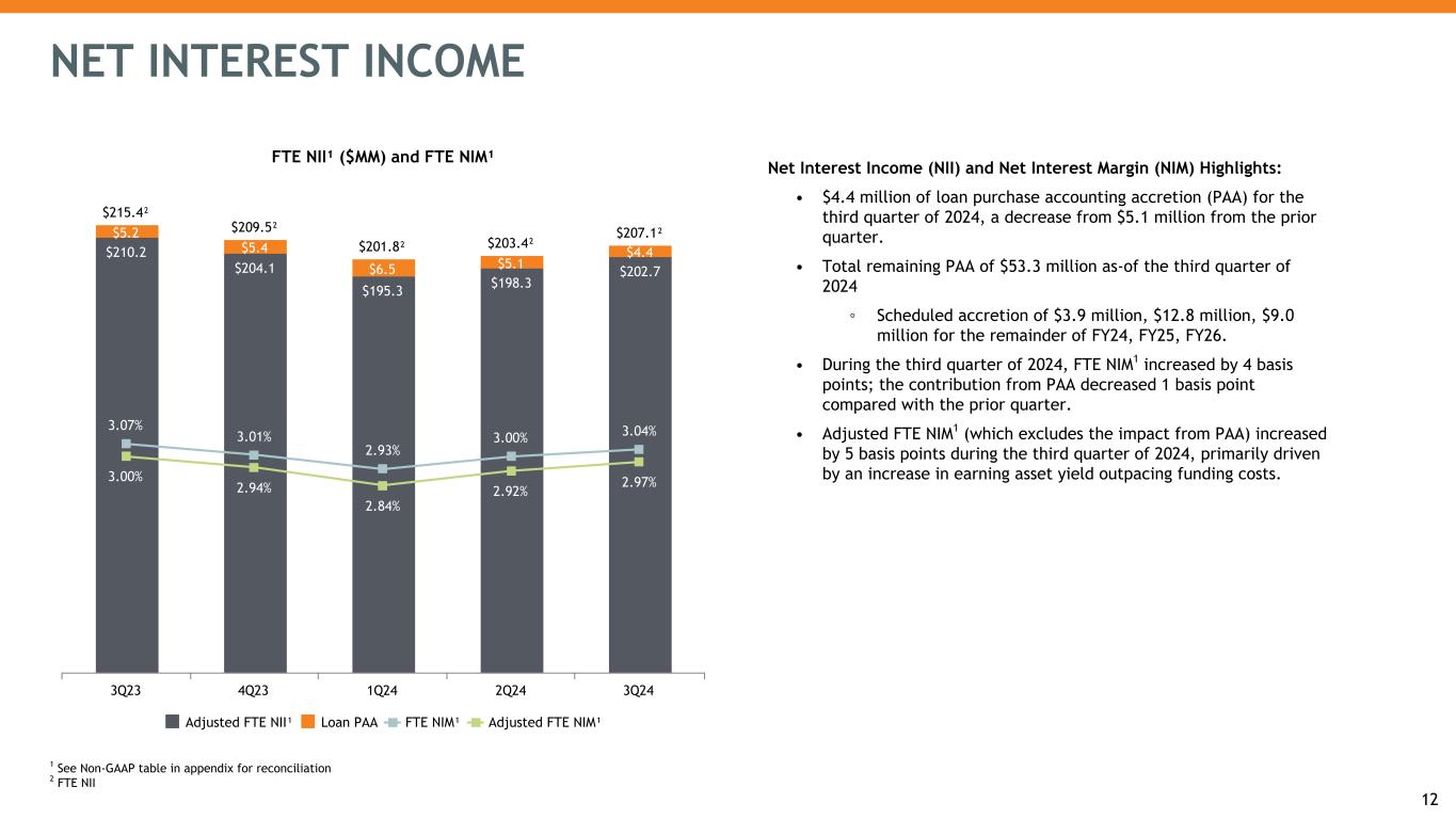 Net Interest Income (NII) and Net Interest Margin (NIM) Highlights: • $4.4 million of loan purchase accounting accretion (PAA) for the third quarter of 2024, a decrease from $5.1 million from the prior quarter. • Total remaining PAA of $53.3 million as-of the third quarter of 2024 ◦ Scheduled accretion of $3.9 million, $12.8 million, $9.0 million for the remainder of FY24, FY25, FY26. • During the third quarter of 2024, FTE NIM1 increased by 4 basis points; the contribution from PAA decreased 1 basis point compared with the prior quarter. • Adjusted FTE NIM1 (which excludes the impact from PAA) increased by 5 basis points during the third quarter of 2024, primarily driven by an increase in earning asset yield outpacing funding costs. NET INTEREST INCOME FTE NII¹ ($MM) and FTE NIM¹ $210.2 $204.1 $195.3 $198.3 $202.7 $5.2 $5.4 $6.5 $5.1 $4.4 $215.4² $209.5² $201.8² $203.4² $207.1² 3.07% 3.01% 2.93% 3.00% 3.04% 3.00% 2.94% 2.84% 2.92% 2.97% Adjusted FTE NII¹ Loan PAA FTE NIM¹ Adjusted FTE NIM¹ 3Q23 4Q23 1Q24 2Q24 3Q24 12 1 See Non-GAAP table in appendix for reconciliation 2 FTE NII