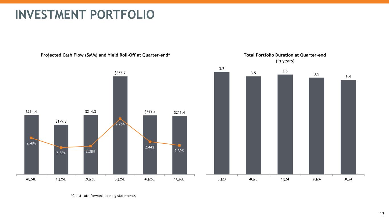 INVESTMENT PORTFOLIO 13 Total Portfolio Duration at Quarter-end 3.7 3.5 3.6 3.5 3.4 3Q23 4Q23 1Q24 2Q24 3Q24 (in years) Projected Cash Flow ($MM) and Yield Roll-Off at Quarter-end* $214.4 $179.8 $214.3 $352.7 $213.4 $211.4 2.49% 2.36% 2.38% 2.75% 2.44% 2.39% 4Q24E 1Q25E 2Q25E 3Q25E 4Q25E 1Q26E *Constitute forward-looking statements