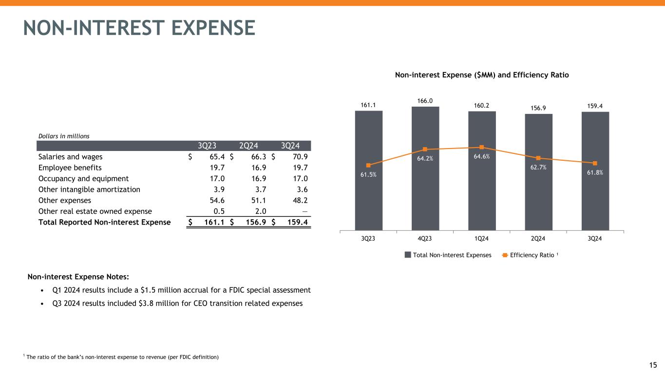 14 3Q24 Non-interest Income by Type Payment Services, 40% Mortgage Banking, 4% Wealth Management, 21% Deposit Service Charges, 14% Other Service Charges & Fees, 5% Other Income, 16% Dollars in millions 3Q23 2Q24 3Q24 Payment services revenues $ 19.2 $ 18.6 $ 18.7 Mortgage banking revenues 2.0 1.7 1.7 Wealth management revenues 8.7 9.4 9.6 Service charges on deposit accounts 6.0 6.4 6.6 Other service charges, commissions and fees 2.2 2.1 2.2 Investment securities losses, net — — — Other income 3.9 4.4 7.6 Total Reported Non-interest Revenue $ 42.0 $ 42.6 $ 46.4 % of Total Revenue 16.4 % 17.4 % 18.4 % NON-INTEREST INCOME Non-interest Income Notes: • Q3 2024 results included $2.6 million for a gain-on-sale of one of our branches.