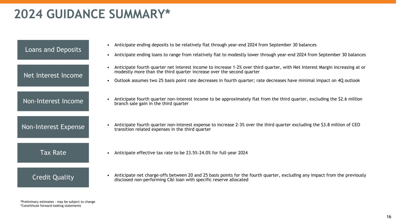 NON-INTEREST EXPENSE 15 Dollars in millions 3Q23 2Q24 3Q24 Salaries and wages $ 65.4 $ 66.3 $ 70.9 Employee benefits 19.7 16.9 19.7 Occupancy and equipment 17.0 16.9 17.0 Other intangible amortization 3.9 3.7 3.6 Other expenses 54.6 51.1 48.2 Other real estate owned expense 0.5 2.0 — Total Reported Non-interest Expense $ 161.1 $ 156.9 $ 159.4 Non-interest Expense ($MM) and Efficiency Ratio 161.1 166.0 160.2 156.9 159.4 61.5% 64.2% 64.6% 62.7% 61.8% Total Non-interest Expenses Efficiency Ratio ¹ 3Q23 4Q23 1Q24 2Q24 3Q24 1 The ratio of the bank’s non-interest expense to revenue (per FDIC definition) Non-interest Expense Notes: • Q1 2024 results include a $1.5 million accrual for a FDIC special assessment • Q3 2024 results included $3.8 million for CEO transition related expenses