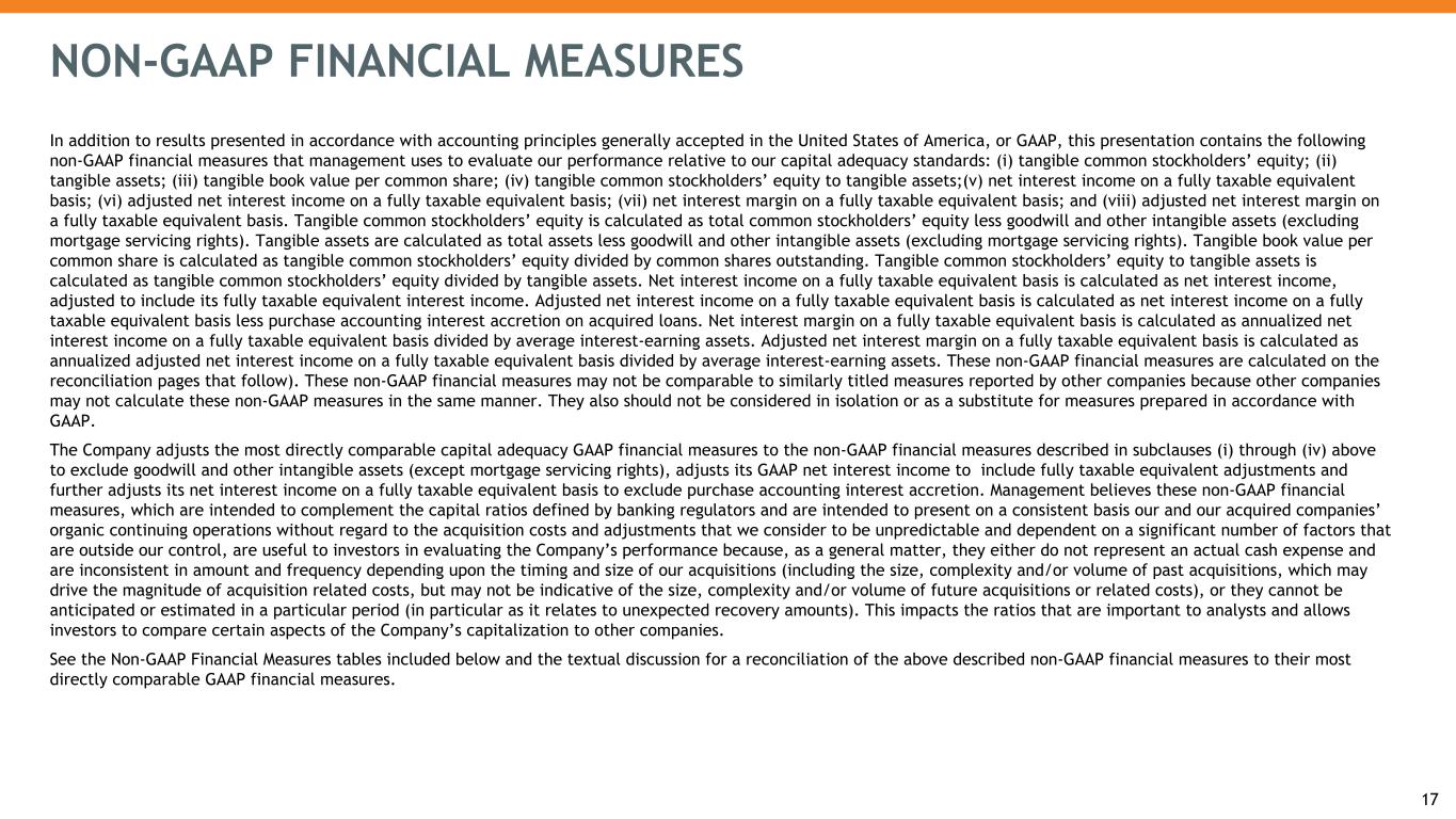 NON-GAAP FINANCIAL MEASURES 17 In addition to results presented in accordance with accounting principles generally accepted in the United States of America, or GAAP, this presentation contains the following non-GAAP financial measures that management uses to evaluate our performance relative to our capital adequacy standards: (i) tangible common stockholders’ equity; (ii) tangible assets; (iii) tangible book value per common share; (iv) tangible common stockholders’ equity to tangible assets;(v) net interest income on a fully taxable equivalent basis; (vi) adjusted net interest income on a fully taxable equivalent basis; (vii) net interest margin on a fully taxable equivalent basis; and (viii) adjusted net interest margin on a fully taxable equivalent basis. Tangible common stockholders’ equity is calculated as total common stockholders’ equity less goodwill and other intangible assets (excluding mortgage servicing rights). Tangible assets are calculated as total assets less goodwill and other intangible assets (excluding mortgage servicing rights). Tangible book value per common share is calculated as tangible common stockholders’ equity divided by common shares outstanding. Tangible common stockholders’ equity to tangible assets is calculated as tangible common stockholders’ equity divided by tangible assets. Net interest income on a fully taxable equivalent basis is calculated as net interest income, adjusted to include its fully taxable equivalent interest income. Adjusted net interest income on a fully taxable equivalent basis is calculated as net interest income on a fully taxable equivalent basis less purchase accounting interest accretion on acquired loans. Net interest margin on a fully taxable equivalent basis is calculated as annualized net interest income on a fully taxable equivalent basis divided by average interest-earning assets. Adjusted net interest margin on a fully taxable equivalent basis is calculated as annualized adjusted net interest income on a fully taxable equivalent basis divided by average interest-earning assets. These non-GAAP financial measures are calculated on the reconciliation pages that follow). These non-GAAP financial measures may not be comparable to similarly titled measures reported by other companies because other companies may not calculate these non-GAAP measures in the same manner. They also should not be considered in isolation or as a substitute for measures prepared in accordance with GAAP. The Company adjusts the most directly comparable capital adequacy GAAP financial measures to the non-GAAP financial measures described in subclauses (i) through (iv) above to exclude goodwill and other intangible assets (except mortgage servicing rights), adjusts its GAAP net interest income to include fully taxable equivalent adjustments and further adjusts its net interest income on a fully taxable equivalent basis to exclude purchase accounting interest accretion. Management believes these non-GAAP financial measures, which are intended to complement the capital ratios defined by banking regulators and are intended to present on a consistent basis our and our acquired companies’ organic continuing operations without regard to the acquisition costs and adjustments that we consider to be unpredictable and dependent on a significant number of factors that are outside our control, are useful to investors in evaluating the Company’s performance because, as a general matter, they either do not represent an actual cash expense and are inconsistent in amount and frequency depending upon the timing and size of our acquisitions (including the size, complexity and/or volume of past acquisitions, which may drive the magnitude of acquisition related costs, but may not be indicative of the size, complexity and/or volume of future acquisitions or related costs), or they cannot be anticipated or estimated in a particular period (in particular as it relates to unexpected recovery amounts). This impacts the ratios that are important to analysts and allows investors to compare certain aspects of the Company’s capitalization to other companies. See the Non-GAAP Financial Measures tables included below and the textual discussion for a reconciliation of the above described non-GAAP financial measures to their most directly comparable GAAP financial measures.