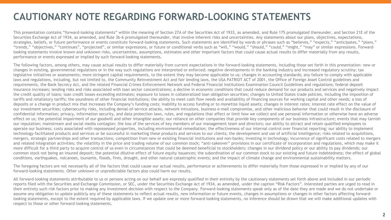 CAUTIONARY NOTE REGARDING FORWARD-LOOKING STATEMENTS This presentation contains “forward-looking statements” within the meaning of Section 27A of the Securities Act of 1933, as amended, and Rule 175 promulgated thereunder, and Section 21E of the Securities Exchange Act of 1934, as amended, and Rule 3b-6 promulgated thereunder, that involve inherent risks and uncertainties. Any statements about our plans, objectives, expectations, strategies, beliefs, or future performance or events constitute forward-looking statements. Such statements are identified by words or phrases such as “believes,” “expects,” “anticipates,” “plans,” “trends,” “objectives,” “continues”, “projected”, or similar expressions, or future or conditional verbs such as “will,” “would,” “should,” “could,” “might,” “may” or similar expressions. Forward- looking statements involve known and unknown risks, uncertainties, assumptions, estimates and other important factors that could cause actual results to differ materially from any results, performance or events expressed or implied by such forward-looking statements. The following factors, among others, may cause actual results to differ materially from current expectations in the forward-looking statements, including those set forth in this presentation: new or changes in existing, governmental regulations or in the way such regulations are interpreted or enforced; negative developments in the banking industry and increased regulatory scrutiny; tax legislative initiatives or assessments; more stringent capital requirements, to the extent they may become applicable to us; changes in accounting standards; any failure to comply with applicable laws and regulations, including, but not limited to, the Community Reinvestment Act and fair lending laws, the USA PATRIOT ACT of 2001, the Office of Foreign Asset Control guidelines and requirements, the Bank Secrecy Act, and the related Financial Crimes Enforcement Network and Federal Financial Institutions Examination Council Guidelines and regulations; federal deposit insurance increases; lending risks and risks associated with loan sector concentrations; a decline in economic conditions that could reduce demand for our products and services and negatively impact the credit quality of loans; loan credit losses exceeding estimates; exposure to losses in collateralized loan obligation securities; changes to United States trade policies, including the imposition of tariffs and retaliatory tariffs; the soundness of other financial institutions; the ability to meet cash flow needs and availability of financing sources for working capital and other needs; a loss of deposits or a change in product mix that increases the Company’s funding costs; inability to access funding or to monetize liquid assets; changes in interest rates; interest rate effect on the value of our investment securities; cybersecurity risks, including denial-of-service attacks, network intrusions, business e-mail compromise, and other malicious behavior that could result in the disclosure of confidential information; privacy, information security, and data protection laws, rules, and regulations that affect or limit how we collect and use personal information or otherwise have an adverse effect on us; the potential impairment of our goodwill and other intangible assets; our reliance on other companies that provide key components of our business infrastructure; events that may tarnish our reputation; mainstream and social media contagion; the loss of the services of key members of our management team and directors; our ability to attract and retain qualified employees to operate our business; costs associated with repossessed properties, including environmental remediation; the effectiveness of our internal control over financial reporting; our ability to implement technology-facilitated products and services or be successful in marketing these products and services to our clients; the development and use of artificial intelligence; risks related to acquisitions, mergers, strategic partnerships and other transactions; competition from new or existing financial institutions and non-banks; investing in technology; incurrence of significant costs related to mergers and related integration activities; the volatility in the price and trading volume of our common stock; “anti-takeover” provisions in our certificate of incorporation and regulations, which may make it more difficult for a third party to acquire control of us even in circumstances that could be deemed beneficial to stockholders; changes in our dividend policy or our ability to pay dividends; our common stock not being an insured deposit; the potential dilutive effect of future equity issuances; the subordination of our common stock to our existing and future indebtedness; the effect of global conditions, earthquakes, volcanoes, tsunamis, floods, fires, drought, and other natural catastrophic events; and the impact of climate change and environmental sustainability matters. The foregoing factors are not necessarily all of the factors that could cause our actual results, performance or achievements to differ materially from those expressed in or implied by any of our forward-looking statements. Other unknown or unpredictable factors also could harm our results. All forward-looking statements attributable to us or persons acting on our behalf are expressly qualified in their entirety by the cautionary statements set forth above and included in our periodic reports filed with the Securities and Exchange Commission, or SEC, under the Securities Exchange Act of 1934, as amended, under the caption “Risk Factors”. Interested parties are urged to read in their entirety such risk factors prior to making any investment decision with respect to the Company. Forward-looking statements speak only as of the date they are made and we do not undertake or assume 