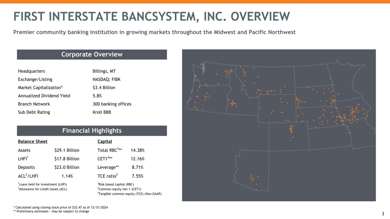 FIRST INTERSTATE BANCSYSTEM, INC. OVERVIEW Premier community banking institution in growing markets throughout the Midwest and Pacific Northwest Financial Highlights Balance Sheet Capital Assets $29.1 Billion Total RBC3** 14.38% LHFI1 $17.8 Billion CET14** 12.16% Deposits $23.0 Billion Leverage** 8.71% ACL2/LHFI 1.14% TCE ratio5 7.55% 1Loans held for investment (LHFI) 3Risk based capital (RBC) 2Allowance for credit losses (ACL) 4Common equity tier-1 (CET1) 5Tangible common equity (TCE) (Non-GAAP) Corporate Overview Headquarters Billings, MT Exchange/Listing NASDAQ: FIBK Market Capitalization* $3.4 Billion Annualized Dividend Yield 5.8% Branch Network 300 banking offices Sub Debt Rating Kroll BBB 3 300 banking offices in 14 states * Calculated using closing stock price of $32.47 as of 12/31/2024 ** Preliminary estimates - may be subject to change