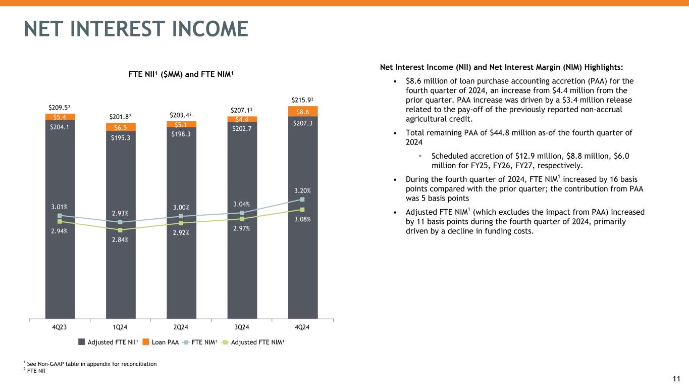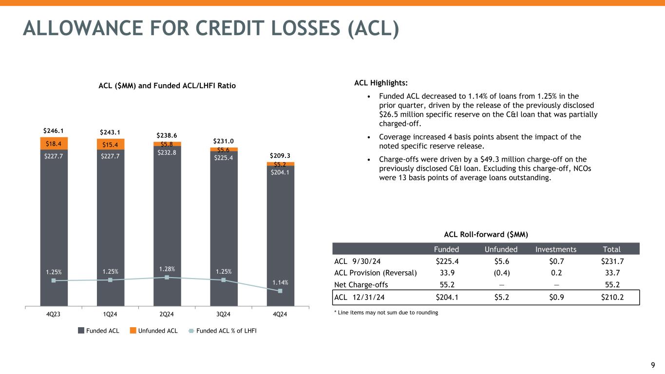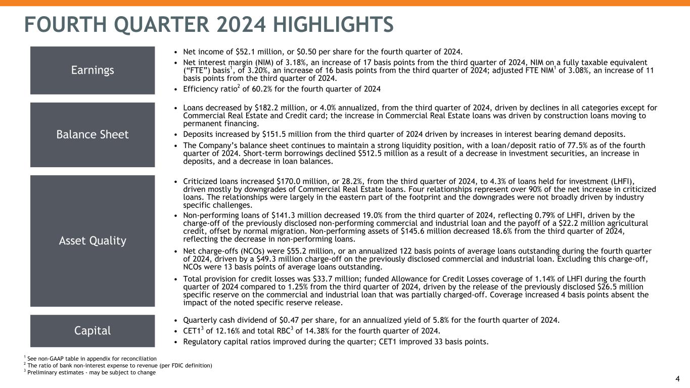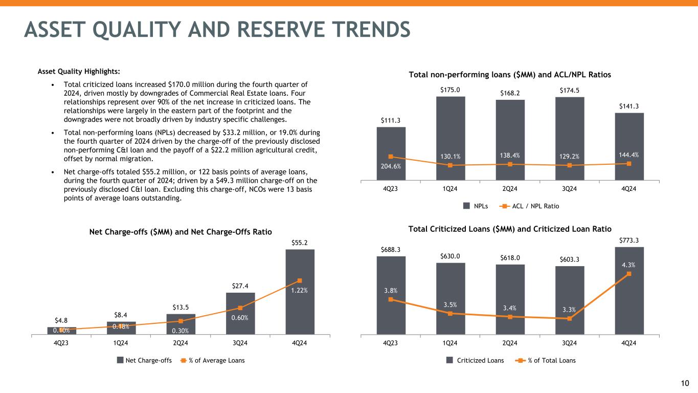 Asset Quality Highlights: • Total criticized loans increased $170.0 million during the fourth quarter of 2024, driven mostly by downgrades of Commercial Real Estate loans. Four relationships represent over 90% of the net increase in criticized loans. The relationships were largely in the eastern part of the footprint and the downgrades were not broadly driven by industry specific challenges. • Total non-performing loans (NPLs) decreased by $33.2 million, or 19.0% during the fourth quarter of 2024 driven by the charge-off of the previously disclosed non-performing C&I loan and the payoff of a $22.2 million agricultural credit, offset by normal migration. • Net charge-offs totaled $55.2 million, or 122 basis points of average loans, during the fourth quarter of 2024; driven by a $49.3 million charge-off on the previously disclosed C&I loan. Excluding this charge-off, NCOs were 13 basis points of average loans outstanding. ASSET QUALITY AND RESERVE TRENDS Net Charge-offs ($MM) and Net Charge-Offs Ratio $4.8 $8.4 $13.5 $27.4 $55.2 0.10% 0.18% 0.30% 0.60% 1.22% Net Charge-offs % of Average Loans 4Q23 1Q24 2Q24 3Q24 4Q24 Total non-performing loans ($MM) and ACL/NPL Ratios $111.3 $175.0 $168.2 $174.5 $141.3 204.6% 130.1% 138.4% 129.2% 144.4% NPLs ACL / NPL Ratio 4Q23 1Q24 2Q24 3Q24 4Q24 Total Criticized Loans ($MM) and Criticized Loan Ratio $688.3 $630.0 $618.0 $603.3 $773.3 3.8% 3.5% 3.4% 3.3% 4.3% Criticized Loans % of Total Loans 4Q23 1Q24 2Q24 3Q24 4Q24 10