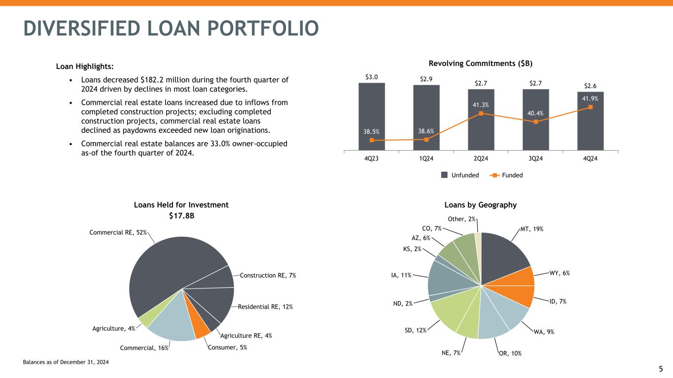 Earnings • Net income of $52.1 million, or $0.50 per share for the fourth quarter of 2024. • Net interest margin (NIM) of 3.18%, an increase of 17 basis points from the third quarter of 2024, NIM on a fully taxable equivalent (“FTE”) basis1, of 3.20%, an increase of 16 basis points from the third quarter of 2024; adjusted FTE NIM1 of 3.08%, an increase of 11 basis points from the third quarter of 2024. • Efficiency ratio2 of 60.2% for the fourth quarter of 2024 Balance Sheet • Loans decreased by $182.2 million, or 4.0% annualized, from the third quarter of 2024, driven by declines in all categories except for Commercial Real Estate and Credit card; the increase in Commercial Real Estate loans was driven by construction loans moving to permanent financing. • Deposits increased by $151.5 million from the third quarter of 2024 driven by increases in interest bearing demand deposits. • The Company’s balance sheet continues to maintain a strong liquidity position, with a loan/deposit ratio of 77.5% as of the fourth quarter of 2024. Short-term borrowings declined $512.5 million as a result of a decrease in investment securities, an increase in deposits, and a decrease in loan balances. Asset Quality • Criticized loans increased $170.0 million, or 28.2%, from the third quarter of 2024, to 4.3% of loans held for investment (LHFI), driven mostly by downgrades of Commercial Real Estate loans. Four relationships represent over 90% of the net increase in criticized loans. The relationships were largely in the eastern part of the footprint and the downgrades were not broadly driven by industry specific challenges. • Non-performing loans of $141.3 million decreased 19.0% from the third quarter of 2024, reflecting 0.79% of LHFI, driven by the charge-off of the previously disclosed non-performing commercial and industrial loan and the payoff of a $22.2 million agricultural credit, offset by normal migration. Non-performing assets of $145.6 million decreased 18.6% from the third quarter of 2024, reflecting the decrease in non-performing loans. • Net charge-offs (NCOs) were $55.2 million, or an annualized 122 basis points of average loans outstanding during the fourth quarter of 2024, driven by a $49.3 million charge-off on the previously disclosed commercial and industrial loan. Excluding this charge-off, NCOs were 13 basis points of average loans outstanding. • Total provision for credit losses was $33.7 million; funded Allowance for Credit Losses coverage of 1.14% of LHFI during the fourth quarter of 2024 compared to 1.25% from the third quarter of 2024, driven by the release of the previously disclosed $26.5 million specific reserve on the commercial and industrial loan that was partially charged-off. Coverage increased 4 basis points absent the impact of the noted specific reserve release. Capital • Quarterly cash dividend of $0.47 per share, for an annualized yield of 5.8% for the fourth quarter of 2024. • CET13 of 12.16% and total RBC3 of 14.38% for the fourth quarter of 2024. • Regulatory capital ratios improved during the quarter; CET1 improved 33 basis points. FOURTH QUARTER 2024 HIGHLIGHTS 4 1 See non-GAAP table in appendix for reconciliation 2 The ratio of bank non-interest expense to revenue (per FDIC definition) 3 Preliminary estimates - may be subject to change