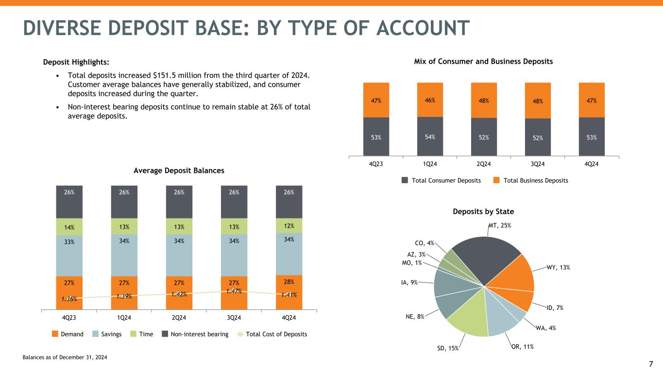 COMMERCIAL REAL ESTATE AND CONSTRUCTION PORTFOLIOS Property Type Multifamily, 24% Medical, 12% Retail, 20% Industrial/Warehouse, 18% Office, 10%Hotel, 9% Land & Development, 3% Other CRE, 2% Residential 1-4 Family, 2% Market Type Metro, 5% Mid-Metro, 8% Non-Metro, 87% 6 Highlights: • $10.5 billion portfolio (59% of total loans), well diversified by property type and geography • Non-owner-occupied portfolio of $6.2 billion (35% of total loans) • $58.7 million of non-accrual loans (0.56% of commercial real estate and construction portfolios) • Montana has the largest state concentration representing 17% of portfolio Balances as of December 31, 2024 Highlights: • Metro defined as property located in Portland, Seattle, Denver, Phoenix, Minneapolis / St. Paul, and Kansas City. • Mid-metro defined as Omaha, Des Moines, Tuscon, and Boise. • Non-metro defined as all other areas.