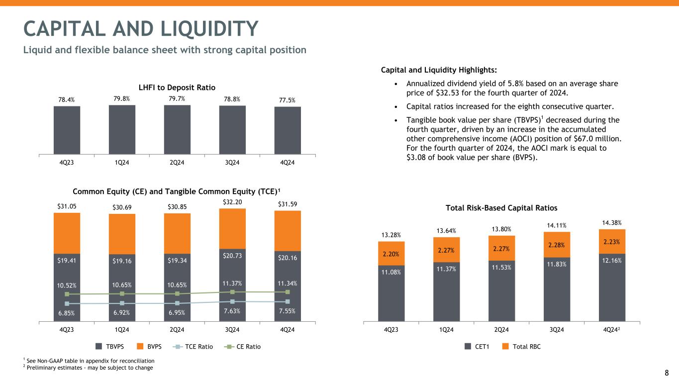 Total Risk-Based Capital Ratios 13.28% 13.64% 13.80% 14.11% 14.38% 11.08% 11.37% 11.53% 11.83% 12.16% 2.20% 2.27% 2.27% 2.28% 2.23% CET1 Total RBC 4Q23 1Q24 2Q24 3Q24 4Q24² CAPITAL AND LIQUIDITY Liquid and flexible balance sheet with strong capital position Common Equity (CE) and Tangible Common Equity (TCE)¹ $31.05 $30.69 $30.85 $32.20 $31.59 $19.41 $19.16 $19.34 $20.73 $20.16 6.85% 6.92% 6.95% 7.63% 7.55% 10.52% 10.65% 10.65% 11.37% 11.34% TBVPS BVPS TCE Ratio CE Ratio 4Q23 1Q24 2Q24 3Q24 4Q24 8 LHFI to Deposit Ratio 78.4% 79.8% 79.7% 78.8% 77.5% 4Q23 1Q24 2Q24 3Q24 4Q24 1 See Non-GAAP table in appendix for reconciliation 2 Preliminary estimates - may be subject to change Capital and Liquidity Highlights: • Annualized dividend yield of 5.8% based on an average share price of $32.53 for the fourth quarter of 2024. • Capital ratios increased for the eighth consecutive quarter. • Tangible book value per share (TBVPS)1 decreased during the fourth quarter, driven by an increase in the accumulated other comprehensive income (AOCI) position of $67.0 million. For the fourth quarter of 2024, the AOCI mark is equal to $3.08 of book value per share (BVPS).