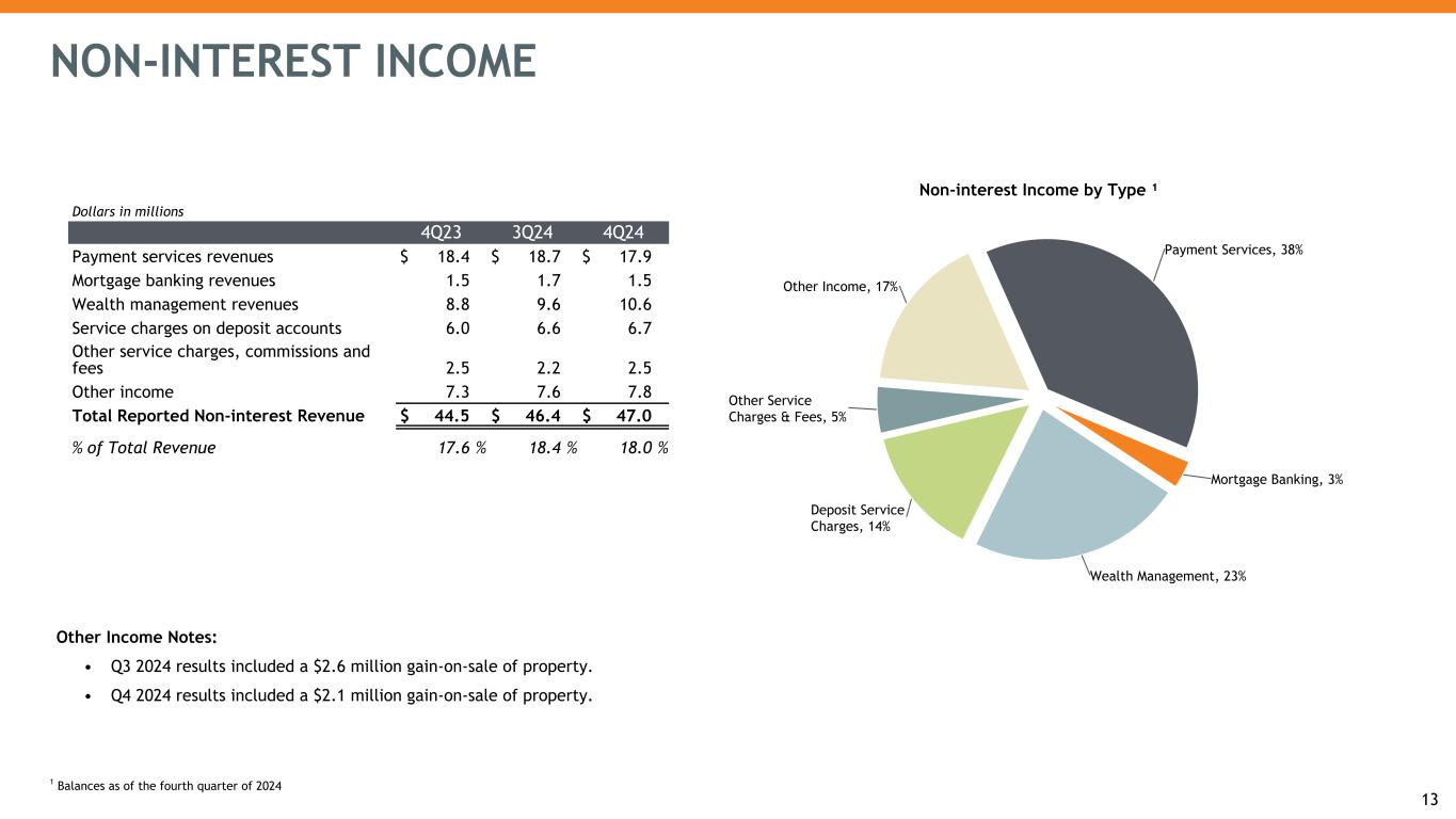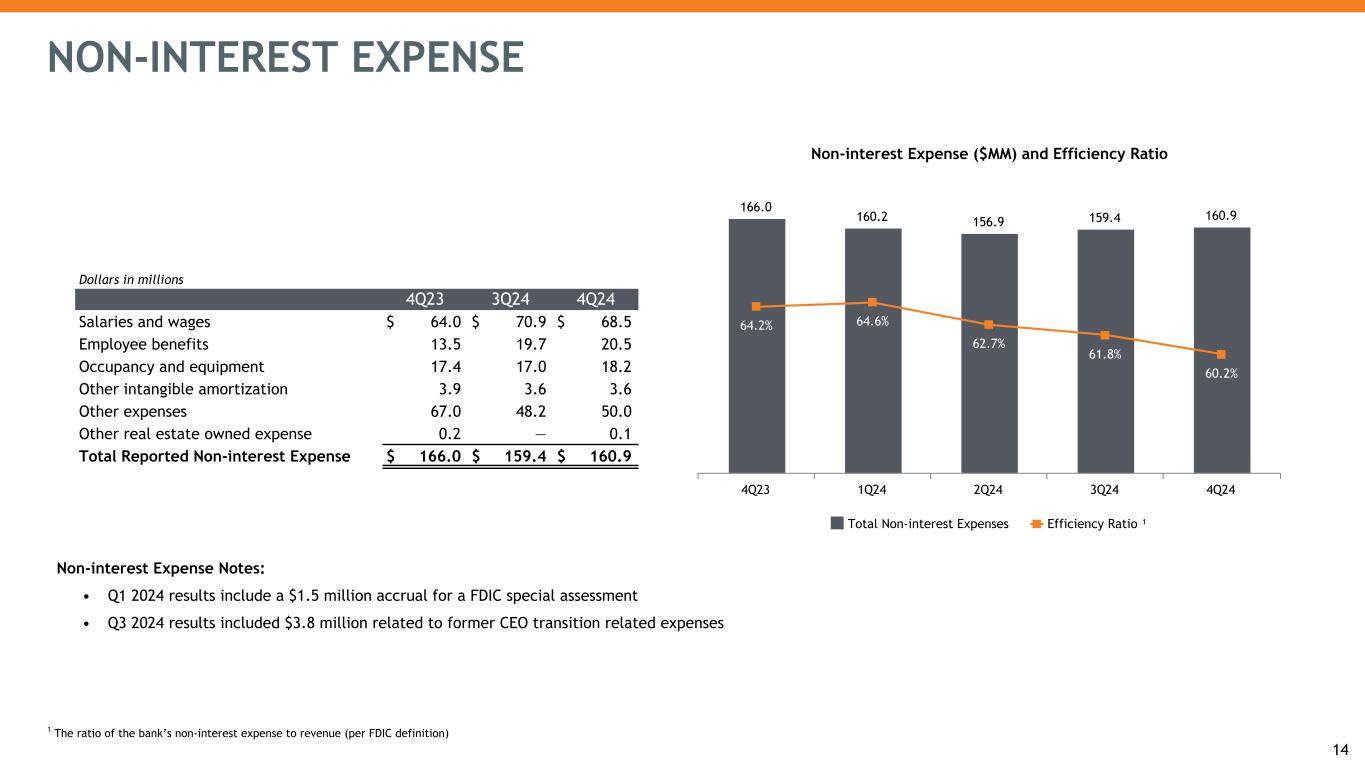 13 Non-interest Income by Type ¹ Payment Services, 38% Mortgage Banking, 3% Wealth Management, 23% Deposit Service Charges, 14% Other Service Charges & Fees, 5% Other Income, 17% Dollars in millions 4Q23 3Q24 4Q24 Payment services revenues $ 18.4 $ 18.7 $ 17.9 Mortgage banking revenues 1.5 1.7 1.5 Wealth management revenues 8.8 9.6 10.6 Service charges on deposit accounts 6.0 6.6 6.7 Other service charges, commissions and fees 2.5 2.2 2.5 Other income 7.3 7.6 7.8 Total Reported Non-interest Revenue $ 44.5 $ 46.4 $ 47.0 % of Total Revenue 17.6 % 18.4 % 18.0 % NON-INTEREST INCOME Other Income Notes: • Q3 2024 results included a $2.6 million gain-on-sale of property. • Q4 2024 results included a $2.1 million gain-on-sale of property. 1 Balances as of the fourth quarter of 2024