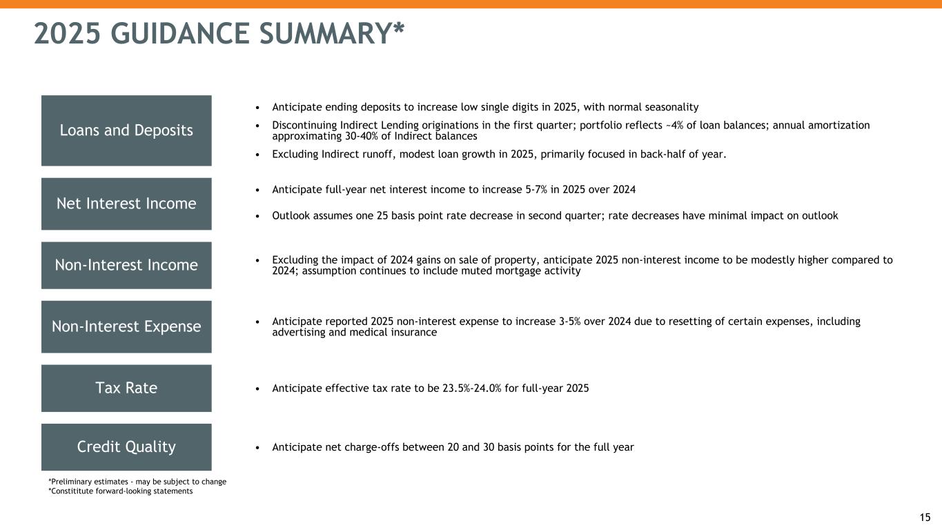 Loans and Deposits • Anticipate ending deposits to increase low single digits in 2025, with normal seasonality • Discontinuing Indirect Lending originations in the first quarter; portfolio reflects ~4% of loan balances; annual amortization approximating 30-40% of Indirect balances • Excluding Indirect runoff, modest loan growth in 2025, primarily focused in back-half of year. Net Interest Income • Anticipate full-year net interest income to increase 5-7% in 2025 over 2024 • Outlook assumes one 25 basis point rate decrease in second quarter; rate decreases have minimal impact on outlook Non-Interest Income • Excluding the impact of 2024 gains on sale of property, anticipate 2025 non-interest income to be modestly higher compared to 2024; assumption continues to include muted mortgage activity Non-Interest Expense • Anticipate reported 2025 non-interest expense to increase 3-5% over 2024 due to resetting of certain expenses, including advertising and medical insurance Tax Rate • Anticipate effective tax rate to be 23.5%-24.0% for full-year 2025 Credit Quality • Anticipate net charge-offs between 20 and 30 basis points for the full year 2025 GUIDANCE SUMMARY* 15 *Preliminary estimates - may be subject to change *Constititute forward-looking statements