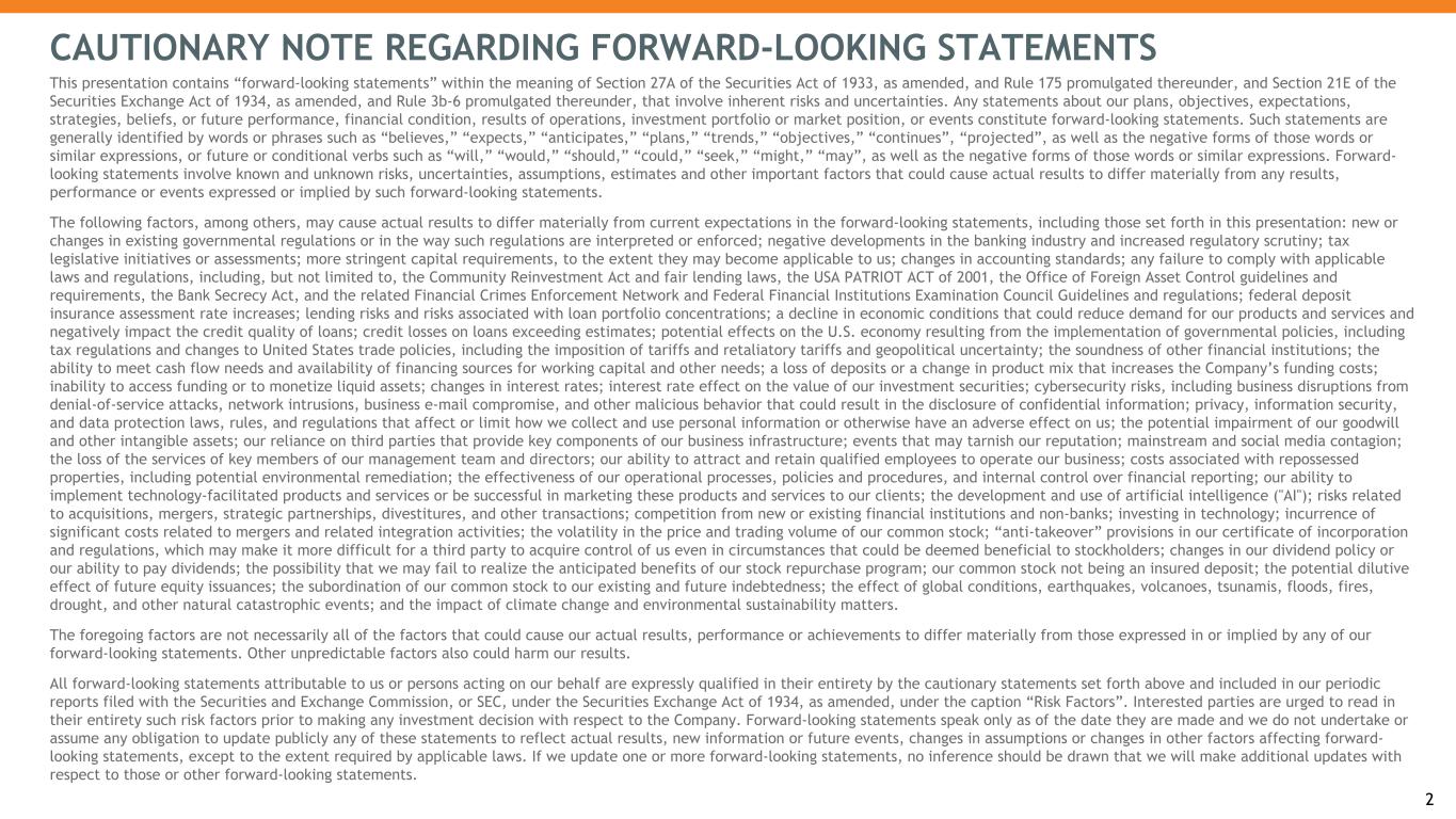 CAUTIONARY NOTE REGARDING FORWARD-LOOKING STATEMENTS This presentation contains “forward-looking statements” within the meaning of Section 27A of the Securities Act of 1933, as amended, and Rule 175 promulgated thereunder, and Section 21E of the Securities Exchange Act of 1934, as amended, and Rule 3b-6 promulgated thereunder, that involve inherent risks and uncertainties. Any statements about our plans, objectives, expectations, strategies, beliefs, or future performance, financial condition, results of operations, investment portfolio or market position, or events constitute forward-looking statements. Such statements are generally identified by words or phrases such as “believes,” “expects,” “anticipates,” “plans,” “trends,” “objectives,” “continues”, “projected”, as well as the negative forms of those words or similar expressions, or future or conditional verbs such as “will,” “would,” “should,” “could,” “seek,” “might,” “may”, as well as the negative forms of those words or similar expressions. Forward- looking statements involve known and unknown risks, uncertainties, assumptions, estimates and other important factors that could cause actual results to differ materially from any results, performance or events expressed or implied by such forward-looking statements. The following factors, among others, may cause actual results to differ materially from current expectations in the forward-looking statements, including those set forth in this presentation: new or changes in existing governmental regulations or in the way such regulations are interpreted or enforced; negative developments in the banking industry and increased regulatory scrutiny; tax legislative initiatives or assessments; more stringent capital requirements, to the extent they may become applicable to us; changes in accounting standards; any failure to comply with applicable laws and regulations, including, but not limited to, the Community Reinvestment Act and fair lending laws, the USA PATRIOT ACT of 2001, the Office of Foreign Asset Control guidelines and requirements, the Bank Secrecy Act, and the related Financial Crimes Enforcement Network and Federal Financial Institutions Examination Council Guidelines and regulations; federal deposit insurance assessment rate increases; lending risks and risks associated with loan portfolio concentrations; a decline in economic conditions that could reduce demand for our products and services and negatively impact the credit quality of loans; credit losses on loans exceeding estimates; potential effects on the U.S. economy resulting from the implementation of governmental policies, including tax regulations and changes to United States trade policies, including the imposition of tariffs and retaliatory tariffs and geopolitical uncertainty; the soundness of other financial institutions; the ability to meet cash flow needs and availability of financing sources for working capital and other needs; a loss of deposits or a change in product mix that increases the Company’s funding costs; inability to access funding or to monetize liquid assets; changes in interest rates; interest rate effect on the value of our investment securities; cybersecurity risks, including business disruptions from denial-of-service attacks, network intrusions, business e-mail compromise, and other malicious behavior that could result in the disclosure of confidential information; privacy, information security, and data protection laws, rules, and regulations that affect or limit how we collect and use personal information or otherwise have an adverse effect on us; the potential impairment of our goodwill and other intangible assets; our reliance on third parties that provide key components of our business infrastructure; events that may tarnish our reputation; mainstream and social media contagion; the loss of the services of key members of our management team and directors; our ability to attract and retain qualified employees to operate our business; costs associated with repossessed properties, including potential environmental remediation; the effectiveness of our operational processes, policies and procedures, and internal control over financial reporting; our ability to implement technology-facilitated products and services or be successful in marketing these products and services to our clients; the development and use of artificial intelligence ("AI"); risks related to acquisitions, mergers, strategic partnerships, divestitures, and other transactions; competition from new or existing financial institutions and non-banks; investing in technology; incurrence of significant costs related to mergers and related integration activities; the volatility in the price and trading volume of our common stock; “anti-takeover” provisions in our certificate of incorporation and regulations, which may make it more difficult for a third party to acquire control of us even in circumstances that could be deemed beneficial to stockholders; changes in our dividend policy or our ability to pay dividends; the possibility that we may fail to realize the anticipated benefits of our stock repurchase program; our common stock not being an insured deposit; the potential dilutive effect of future equity issuances; the subordination of our common stock to our existing and future indebtedness; the effect of global conditions, earthquakes, volcanoes, tsunamis, floods, fires, drought, and other natural catastrophic events; and the impact of climate change and environmental sustainability matters. The foregoing factors are not necessarily all of the factors that could cause our actual results, performance or achievements to differ materially from those expressed in or implied by any of our forward-looking statements. Other unpredictable factors also could harm our results. All forward-looking statements attributable to us or persons acting on our behalf are exp