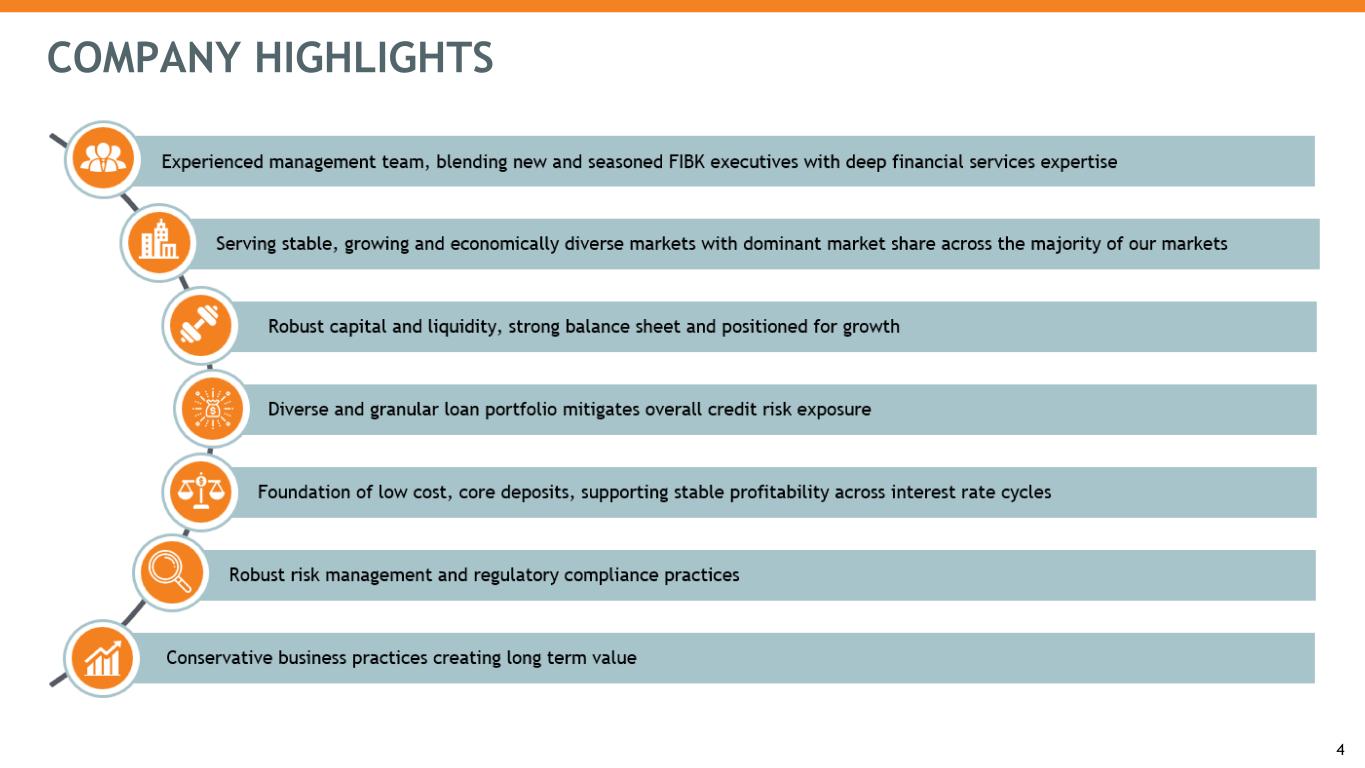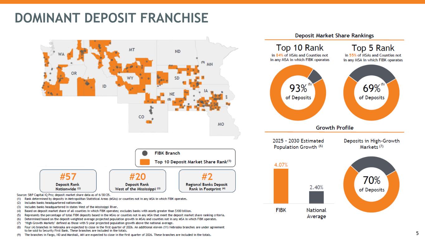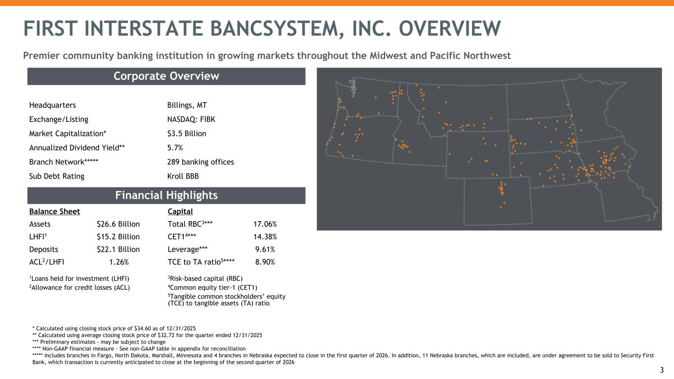 FIRST INTERSTATE BANCSYSTEM, INC. OVERVIEW Premier community banking institution in growing markets throughout the Midwest and Pacific Northwest Financial Highlights Balance Sheet Capital Assets $26.6 Billion Total RBC3*** 17.06% LHFI1 $15.2 Billion CET14*** 14.38% Deposits $22.1 Billion Leverage*** 9.61% ACL2/LHFI 1.26% TCE to TA ratio5**** 8.90% 1Loans held for investment (LHFI) 3Risk-based capital (RBC) 2Allowance for credit losses (ACL) 4Common equity tier-1 (CET1) 5Tangible common stockholders’ equity (TCE) to tangible assets (TA) ratio Corporate Overview Headquarters Billings, MT Exchange/Listing NASDAQ: FIBK Market Capitalization* $3.5 Billion Annualized Dividend Yield** 5.7% Branch Network***** 289 banking offices Sub Debt Rating Kroll BBB 3 * Calculated using closing stock price of $34.60 as of 12/31/2025 ** Calculated using average closing stock price of $32.72 for the quarter ended 12/31/2025 *** Preliminary estimates - may be subject to change **** Non-GAAP financial measure - See non-GAAP table in appendix for reconciliation ***** Includes branches in Fargo, North Dakota, Marshall, Minnesota and 4 branches in Nebraska expected to close in the first quarter of 2026. In addition, 11 Nebraska branches, which are included, are under agreement to be sold to Security First Bank, which transaction is currently anticipated to close at the beginning of the second quarter of 2026