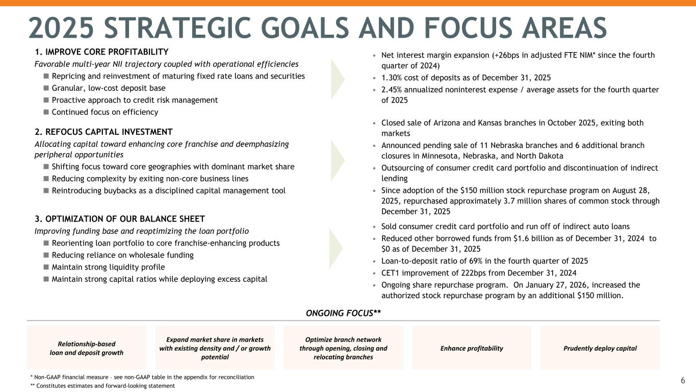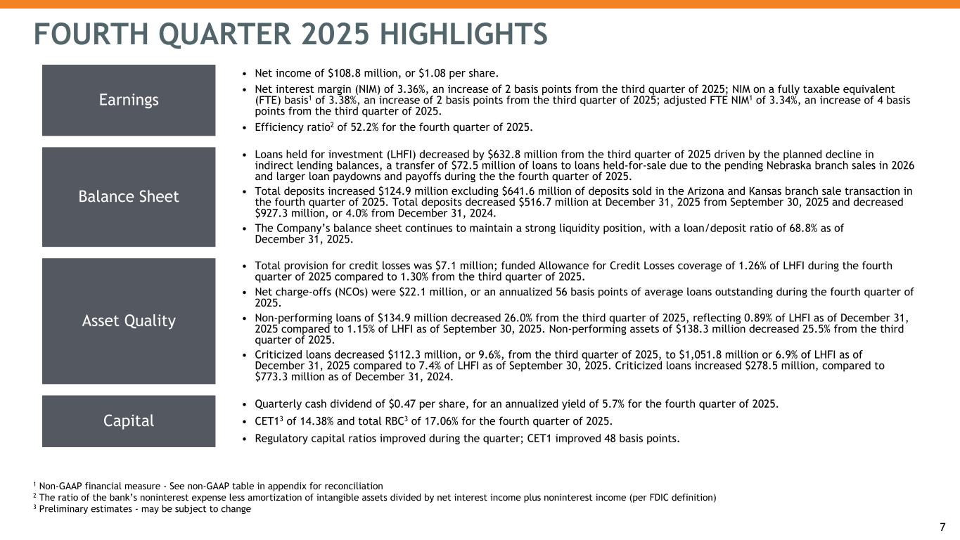 6 2025 STRATEGIC GOALS AND FOCUS AREAS 1. IMPROVE CORE PROFITABILITY Favorable multi-year NII trajectory coupled with operational efficiencies ■ Repricing and reinvestment of maturing fixed rate loans and securities ■ Granular, low-cost deposit base ■ Proactive approach to credit risk management ■ Continued focus on efficiency 2. REFOCUS CAPITAL INVESTMENT Allocating capital toward enhancing core franchise and deemphasizing peripheral opportunities ■ Shifting focus toward core geographies with dominant market share ■ Reducing complexity by exiting non-core business lines ■ Reintroducing buybacks as a disciplined capital management tool 3. OPTIMIZATION OF OUR BALANCE SHEET Improving funding base and reoptimizing the loan portfolio ■ Reorienting loan portfolio to core franchise-enhancing products ■ Reducing reliance on wholesale funding ■ Maintain strong liquidity profile ■ Maintain strong capital ratios while deploying excess capital • Net interest margin expansion (+26bps in adjusted FTE NIM* since the fourth quarter of 2024) • 1.30% cost of deposits as of December 31, 2025 • 2.45% annualized noninterest expense / average assets for the fourth quarter of 2025 • Closed sale of Arizona and Kansas branches in October 2025, exiting both markets • Announced pending sale of 11 Nebraska branches and 6 additional branch closures in Minnesota, Nebraska, and North Dakota • Outsourcing of consumer credit card portfolio and discontinuation of indirect lending • Since adoption of the $150 million stock repurchase program on August 28, 2025, repurchased approximately 3.7 million shares of common stock through December 31, 2025 • Sold consumer credit card portfolio and run off of indirect auto loans • Reduced other borrowed funds from $1.6 billion as of December 31, 2024 to $0 as of December 31, 2025 • Loan-to-deposit ratio of 69% in the fourth quarter of 2025 • CET1 improvement of 222bps from December 31, 2024 • Ongoing share repurchase program. On January 27, 2026, increased the authorized stock repurchase program by an additional $150 million. * Non-GAAP financial measure – see non-GAAP table in the appendix for reconciliation ** Constitutes estimates and forward-looking statement Relationship-based loan and deposit growth Expand market share in markets with existing density and / or growth potential Optimize branch network through opening, closing and relocating branches Enhance profitability Prudently deploy capital ONGOING FOCUS**
