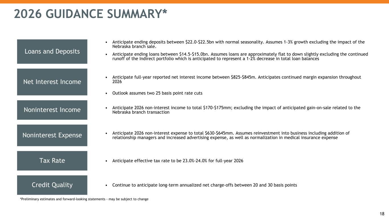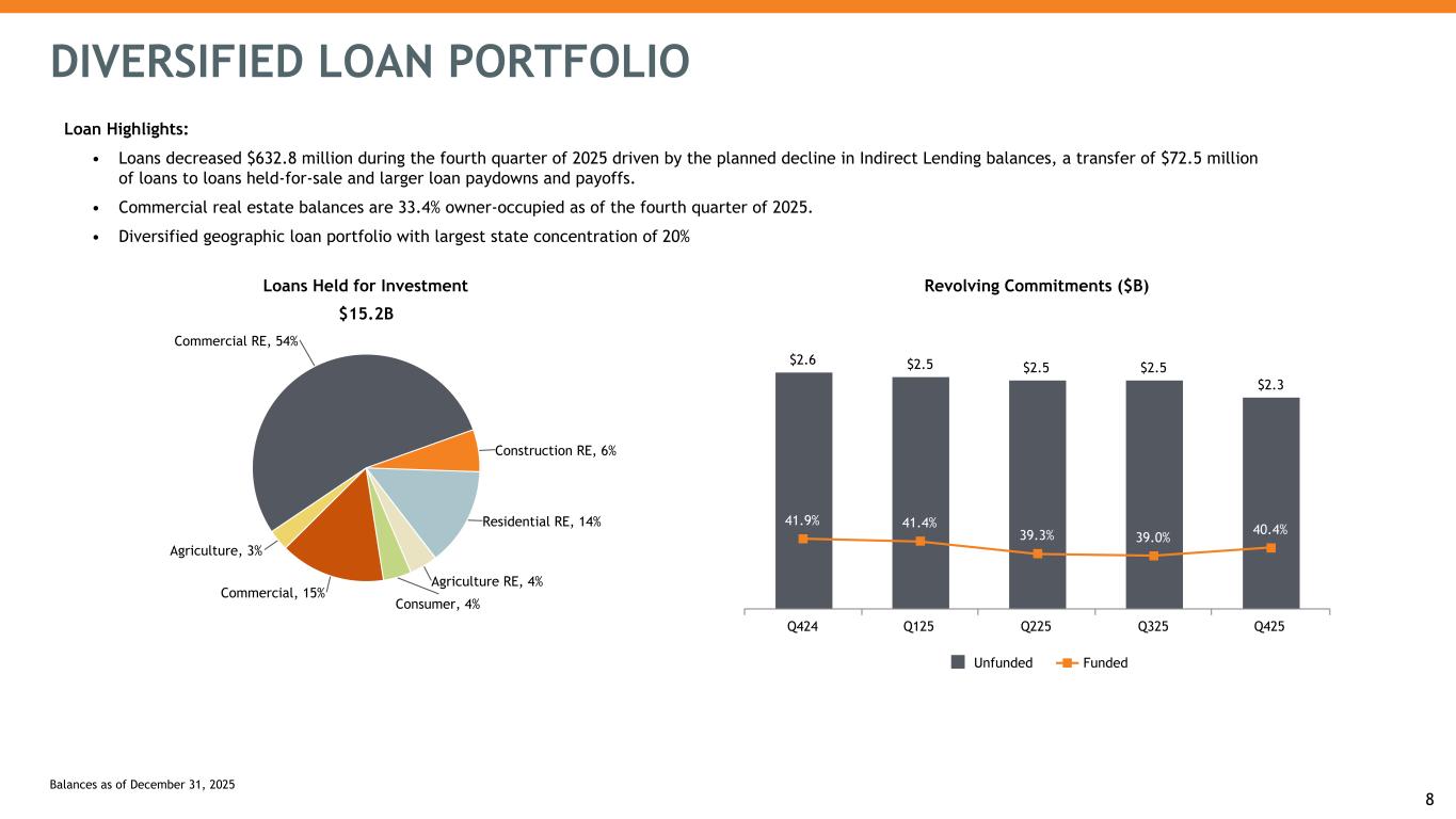 Earnings • Net income of $108.8 million, or $1.08 per share. • Net interest margin (NIM) of 3.36%, an increase of 2 basis points from the third quarter of 2025; NIM on a fully taxable equivalent (FTE) basis1 of 3.38%, an increase of 2 basis points from the third quarter of 2025; adjusted FTE NIM1 of 3.34%, an increase of 4 basis points from the third quarter of 2025. • Efficiency ratio2 of 52.2% for the fourth quarter of 2025. Balance Sheet • Loans held for investment (LHFI) decreased by $632.8 million from the third quarter of 2025 driven by the planned decline in indirect lending balances, a transfer of $72.5 million of loans to loans held-for-sale due to the pending Nebraska branch sales in 2026 and larger loan paydowns and payoffs during the the fourth quarter of 2025. • Total deposits increased $124.9 million excluding $641.6 million of deposits sold in the Arizona and Kansas branch sale transaction in the fourth quarter of 2025. Total deposits decreased $516.7 million at December 31, 2025 from September 30, 2025 and decreased $927.3 million, or 4.0% from December 31, 2024. • The Company’s balance sheet continues to maintain a strong liquidity position, with a loan/deposit ratio of 68.8% as of December 31, 2025. Asset Quality • Total provision for credit losses was $7.1 million; funded Allowance for Credit Losses coverage of 1.26% of LHFI during the fourth quarter of 2025 compared to 1.30% from the third quarter of 2025. • Net charge-offs (NCOs) were $22.1 million, or an annualized 56 basis points of average loans outstanding during the fourth quarter of 2025. • Non-performing loans of $134.9 million decreased 26.0% from the third quarter of 2025, reflecting 0.89% of LHFI as of December 31, 2025 compared to 1.15% of LHFI as of September 30, 2025. Non-performing assets of $138.3 million decreased 25.5% from the third quarter of 2025. • Criticized loans decreased $112.3 million, or 9.6%, from the third quarter of 2025, to $1,051.8 million or 6.9% of LHFI as of December 31, 2025 compared to 7.4% of LHFI as of September 30, 2025. Criticized loans increased $278.5 million, compared to $773.3 million as of December 31, 2024. Capital • Quarterly cash dividend of $0.47 per share, for an annualized yield of 5.7% for the fourth quarter of 2025. • CET13 of 14.38% and total RBC3 of 17.06% for the fourth quarter of 2025. • Regulatory capital ratios improved during the quarter; CET1 improved 48 basis points. FOURTH QUARTER 2025 HIGHLIGHTS 7 1 Non-GAAP financial measure - See non-GAAP table in appendix for reconciliation 2 The ratio of the bank’s noninterest expense less amortization of intangible assets divided by net interest income plus noninterest income (per FDIC definition) 3 Preliminary estimates - may be subject to change