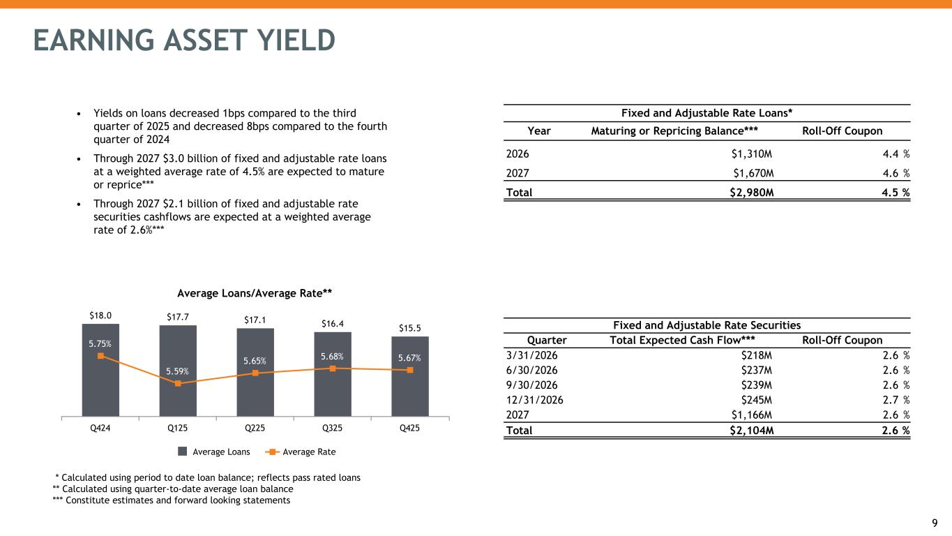 DIVERSIFIED LOAN PORTFOLIO Loans Held for Investment Commercial RE, 54% Construction RE, 6% Residential RE, 14% Agriculture RE, 4% Consumer, 4% Commercial, 15% Agriculture, 3% Revolving Commitments ($B) $2.6 $2.5 $2.5 $2.5 $2.3 41.9% 41.4% 39.3% 39.0% 40.4% Unfunded Funded Q424 Q125 Q225 Q325 Q425 8 $15.2B Balances as of December 31, 2025 Loan Highlights: • Loans decreased $632.8 million during the fourth quarter of 2025 driven by the planned decline in Indirect Lending balances, a transfer of $72.5 million of loans to loans held-for-sale and larger loan paydowns and payoffs. • Commercial real estate balances are 33.4% owner-occupied as of the fourth quarter of 2025. • Diversified geographic loan portfolio with largest state concentration of 20%