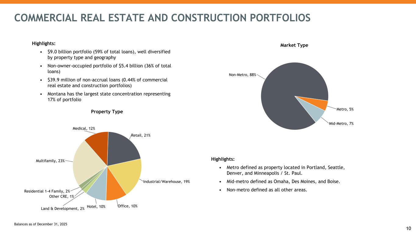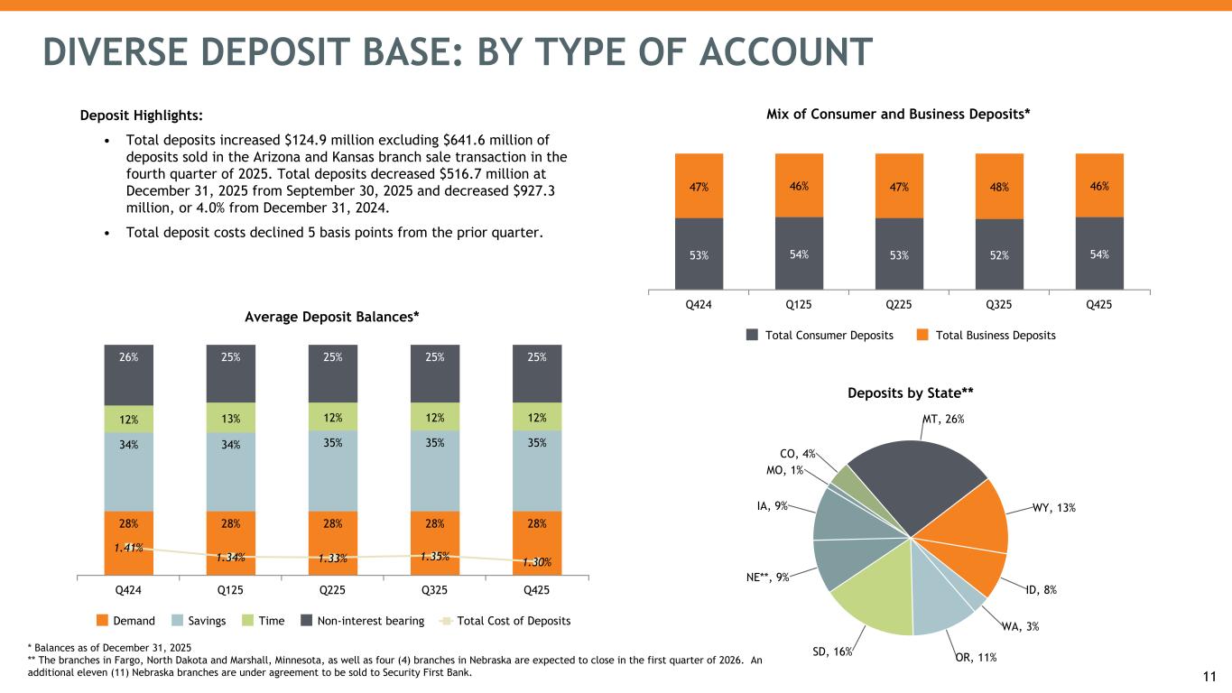 COMMERCIAL REAL ESTATE AND CONSTRUCTION PORTFOLIOS Property Type Multifamily, 23% Medical, 12% Retail, 21% Industrial/Warehouse, 19% Office, 10%Hotel, 10%Land & Development, 2% Other CRE, 1% Residential 1-4 Family, 2% Market Type Metro, 5% Mid-Metro, 7% Non-Metro, 88% 10 Highlights: • $9.0 billion portfolio (59% of total loans), well diversified by property type and geography • Non-owner-occupied portfolio of $5.4 billion (36% of total loans) • $39.9 million of non-accrual loans (0.44% of commercial real estate and construction portfolios) • Montana has the largest state concentration representing 17% of portfolio Balances as of December 31, 2025 Highlights: • Metro defined as property located in Portland, Seattle, Denver, and Minneapolis / St. Paul. • Mid-metro defined as Omaha, Des Moines, and Boise. • Non-metro defined as all other areas.