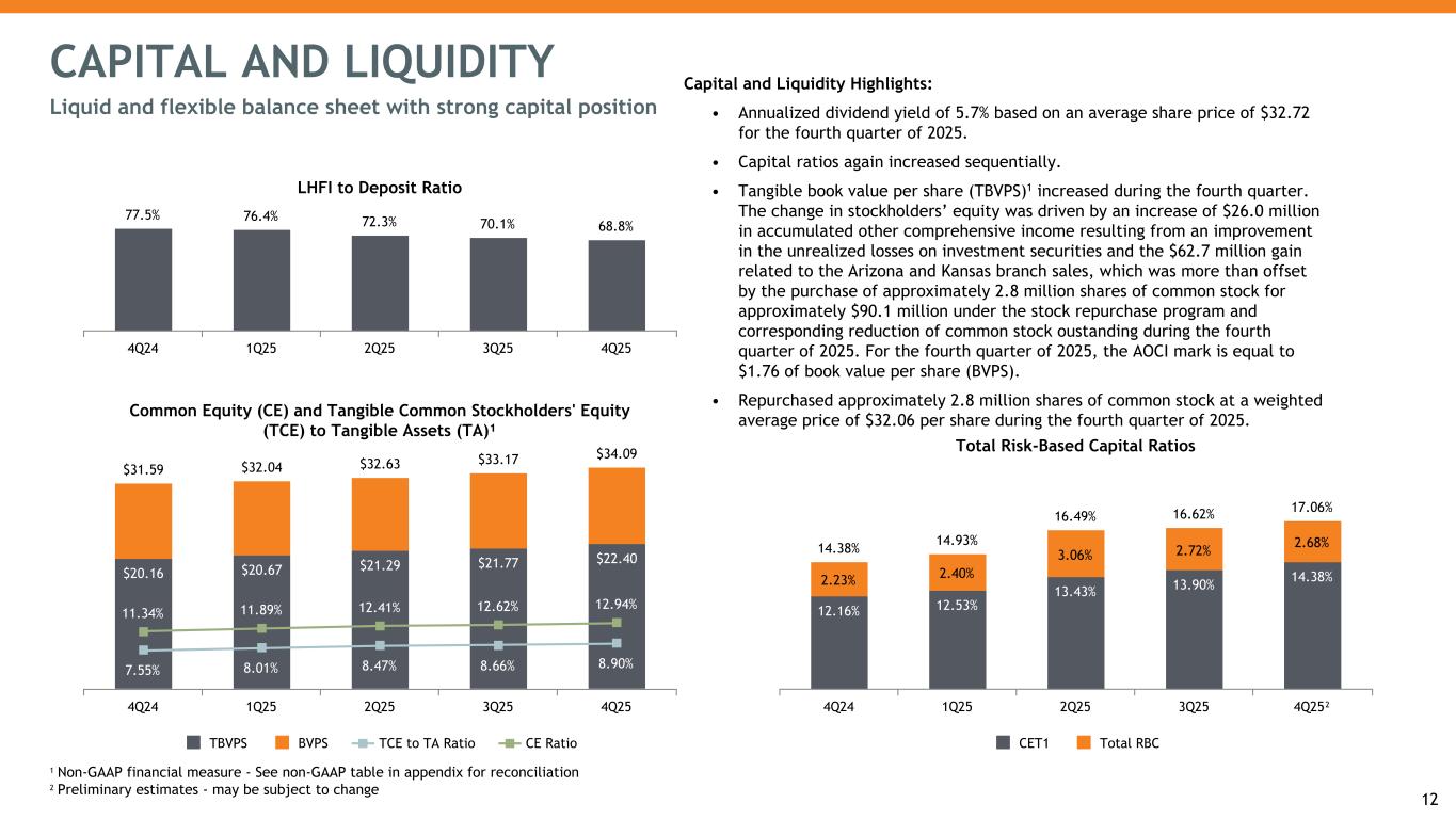 Total Risk-Based Capital Ratios 14.38% 14.93% 16.49% 16.62% 17.06% 12.16% 12.53% 13.43% 13.90% 14.38%2.23% 2.40% 3.06% 2.72% 2.68% CET1 Total RBC 4Q24 1Q25 2Q25 3Q25 4Q25² CAPITAL AND LIQUIDITY Liquid and flexible balance sheet with strong capital position Common Equity (CE) and Tangible Common Stockholders' Equity (TCE) to Tangible Assets (TA)¹ $31.59 $32.04 $32.63 $33.17 $34.09 $20.16 $20.67 $21.29 $21.77 $22.40 7.55% 8.01% 8.47% 8.66% 8.90% 11.34% 11.89% 12.41% 12.62% 12.94% TBVPS BVPS TCE to TA Ratio CE Ratio 4Q24 1Q25 2Q25 3Q25 4Q25 12 LHFI to Deposit Ratio 77.5% 76.4% 72.3% 70.1% 68.8% 4Q24 1Q25 2Q25 3Q25 4Q25 1 Non-GAAP financial measure - See non-GAAP table in appendix for reconciliation 2 Preliminary estimates - may be subject to change Capital and Liquidity Highlights: • Annualized dividend yield of 5.7% based on an average share price of $32.72 for the fourth quarter of 2025. • Capital ratios again increased sequentially. • Tangible book value per share (TBVPS)1 increased during the fourth quarter. The change in stockholders’ equity was driven by an increase of $26.0 million in accumulated other comprehensive income resulting from an improvement in the unrealized losses on investment securities and the $62.7 million gain related to the Arizona and Kansas branch sales, which was more than offset by the purchase of approximately 2.8 million shares of common stock for approximately $90.1 million under the stock repurchase program and corresponding reduction of common stock oustanding during the fourth quarter of 2025. For the fourth quarter of 2025, the AOCI mark is equal to $1.76 of book value per share (BVPS). • Repurchased approximately 2.8 million shares of common stock at a weighted average price of $32.06 per share during the fourth quarter of 2025.
