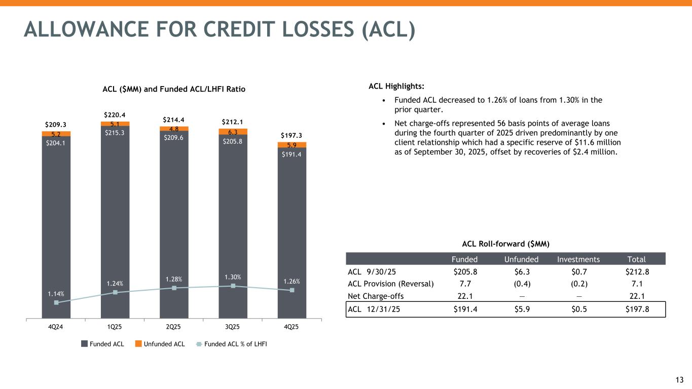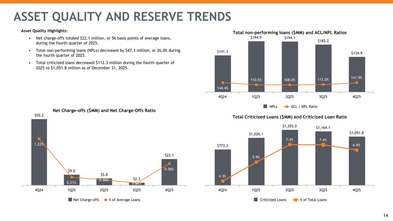 Asset Quality Highlights: • Net charge-offs totaled $22.1 million, or 56 basis points of average loans, during the fourth quarter of 2025. • Total non-performing loans (NPLs) decreased by $47.3 million, or 26.0% during the fourth quarter of 2025. • Total criticized loans decreased $112.3 million during the fourth quarter of 2025 to $1,051.8 million as of December 31, 2025. ASSET QUALITY AND RESERVE TRENDS Net Charge-offs ($MM) and Net Charge-Offs Ratio $55.2 $9.0 $5.8 $2.3 $22.1 1.22% 0.21% 0.14% 0.06% 0.56% Net Charge-offs % of Average Loans 4Q24 1Q25 2Q25 3Q25 4Q25 Total non-performing loans ($MM) and ACL/NPL Ratios $141.3 $194.9 $194.1 $182.2 $134.9 144.4% 110.5% 108.0% 113.0% 141.9% NPLs ACL / NPL Ratio 4Q24 1Q25 2Q25 3Q25 4Q25 Total Criticized Loans ($MM) and Criticized Loan Ratio $773.3 $1,026.1 $1,203.0 $1,164.1 $1,051.8 4.3% 5.9% 7.4% 7.4% 6.9% Criticized Loans % of Total Loans 4Q24 1Q25 2Q25 3Q25 4Q25 14