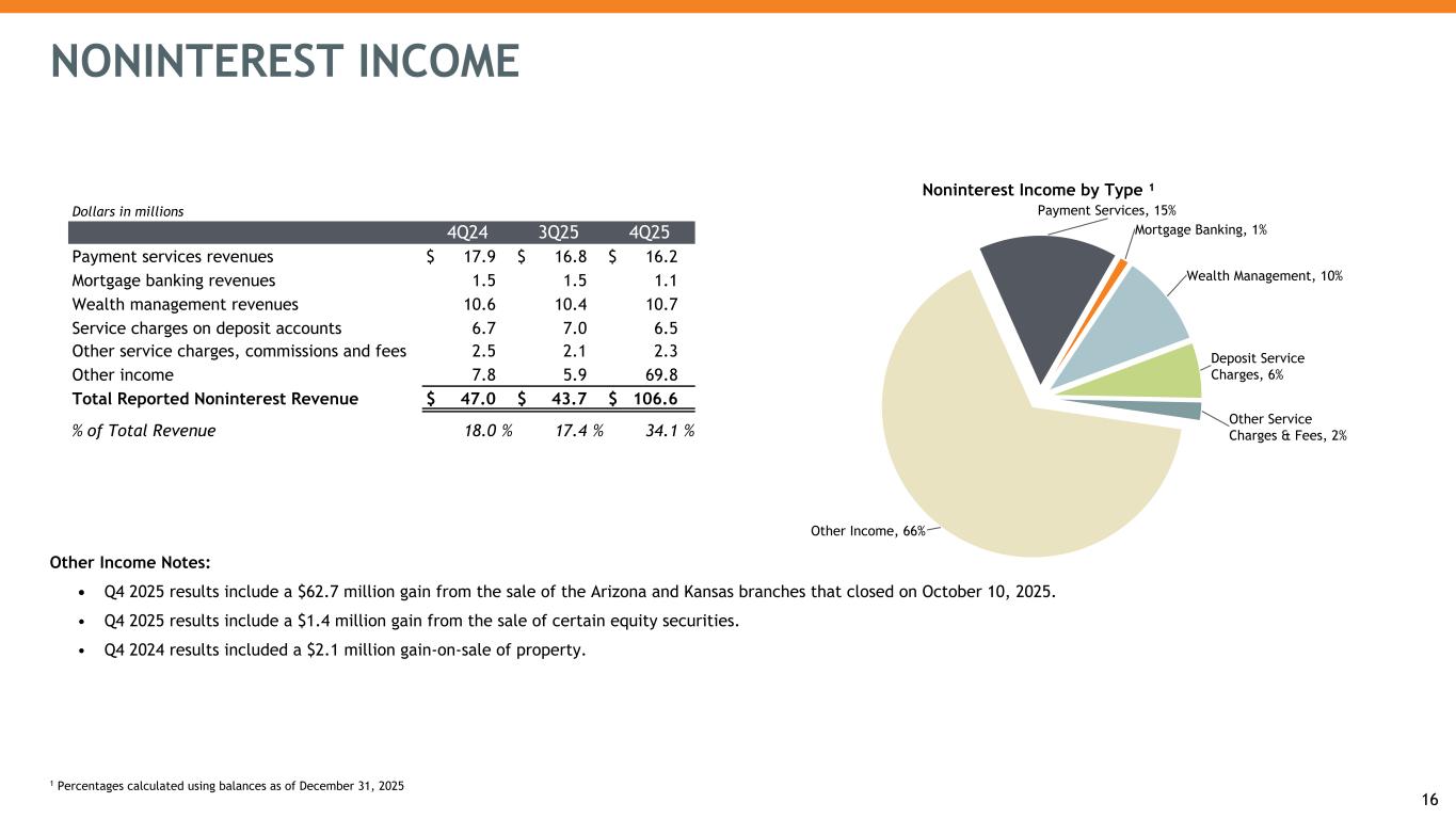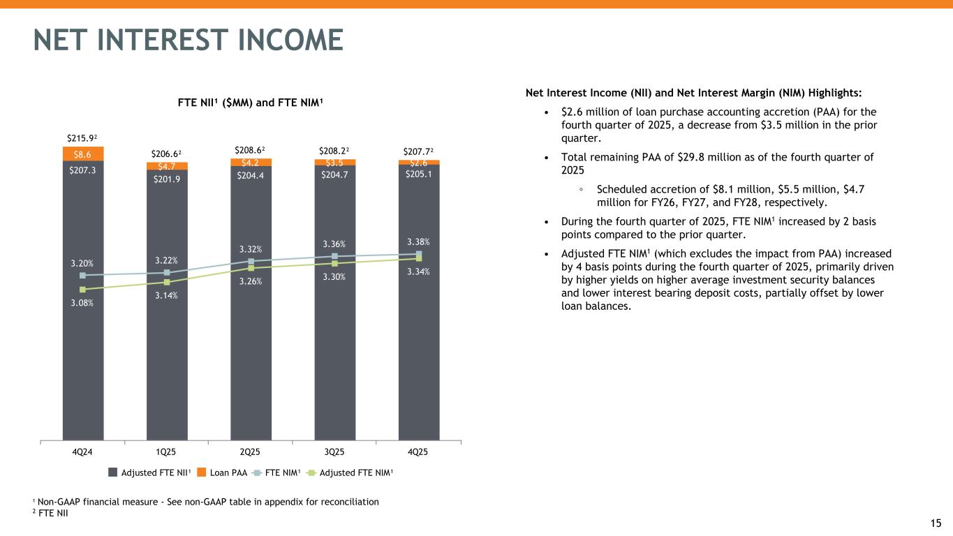 Net Interest Income (NII) and Net Interest Margin (NIM) Highlights: • $2.6 million of loan purchase accounting accretion (PAA) for the fourth quarter of 2025, a decrease from $3.5 million in the prior quarter. • Total remaining PAA of $29.8 million as of the fourth quarter of 2025 ◦ Scheduled accretion of $8.1 million, $5.5 million, $4.7 million for FY26, FY27, and FY28, respectively. • During the fourth quarter of 2025, FTE NIM1 increased by 2 basis points compared to the prior quarter. • Adjusted FTE NIM1 (which excludes the impact from PAA) increased by 4 basis points during the fourth quarter of 2025, primarily driven by higher yields on higher average investment security balances and lower interest bearing deposit costs, partially offset by lower loan balances. NET INTEREST INCOME FTE NII¹ ($MM) and FTE NIM¹ $207.3 $201.9 $204.4 $204.7 $205.1 $8.6 $4.7 $4.2 $3.5 $2.6 $215.9² $206.6² $208.6² $208.2² $207.7² 3.20% 3.22% 3.32% 3.36% 3.38% 3.08% 3.14% 3.26% 3.30% 3.34% Adjusted FTE NII¹ Loan PAA FTE NIM¹ Adjusted FTE NIM¹ 4Q24 1Q25 2Q25 3Q25 4Q25 15 1 Non-GAAP financial measure - See non-GAAP table in appendix for reconciliation 2 FTE NII