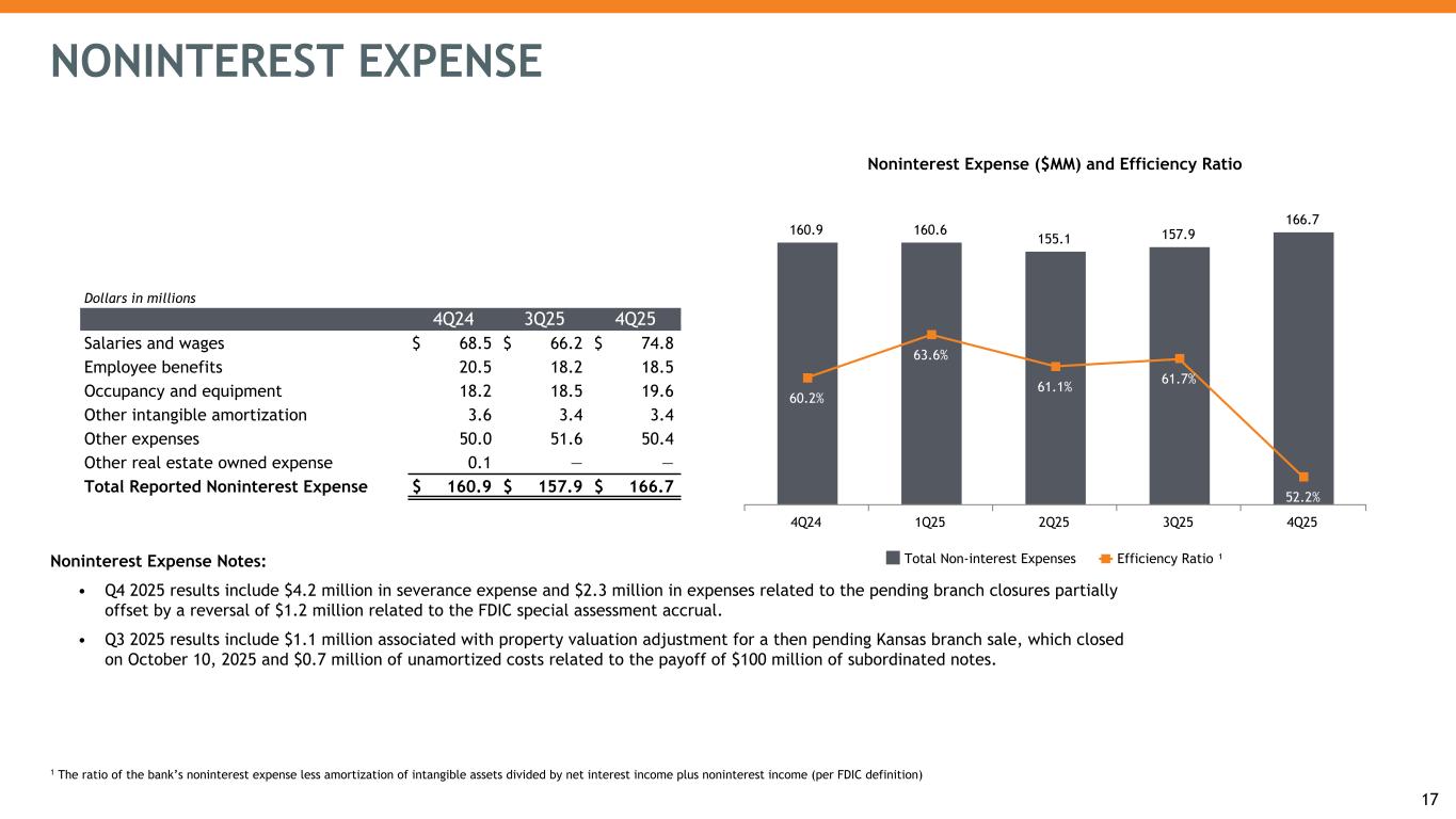 16 Noninterest Income by Type ¹ Payment Services, 15% Mortgage Banking, 1% Wealth Management, 10% Deposit Service Charges, 6% Other Service Charges & Fees, 2% Other Income, 66% Dollars in millions 4Q24 3Q25 4Q25 Payment services revenues $ 17.9 $ 16.8 $ 16.2 Mortgage banking revenues 1.5 1.5 1.1 Wealth management revenues 10.6 10.4 10.7 Service charges on deposit accounts 6.7 7.0 6.5 Other service charges, commissions and fees 2.5 2.1 2.3 Other income 7.8 5.9 69.8 Total Reported Noninterest Revenue $ 47.0 $ 43.7 $ 106.6 % of Total Revenue 18.0 % 17.4 % 34.1 % NONINTEREST INCOME 1 Percentages calculated using balances as of December 31, 2025 Other Income Notes: • Q4 2025 results include a $62.7 million gain from the sale of the Arizona and Kansas branches that closed on October 10, 2025. • Q4 2025 results include a $1.4 million gain from the sale of certain equity securities. • Q4 2024 results included a $2.1 million gain-on-sale of property.