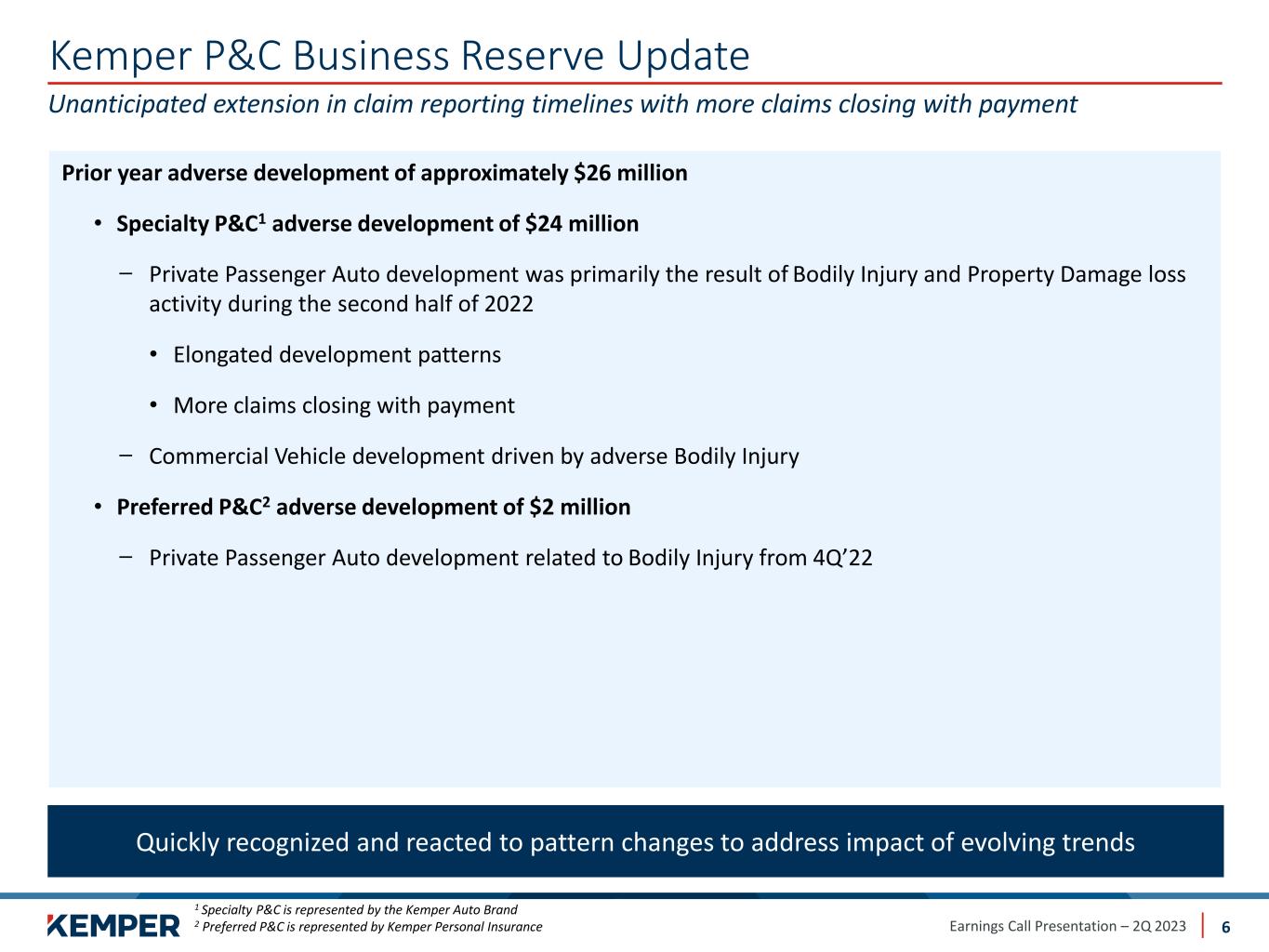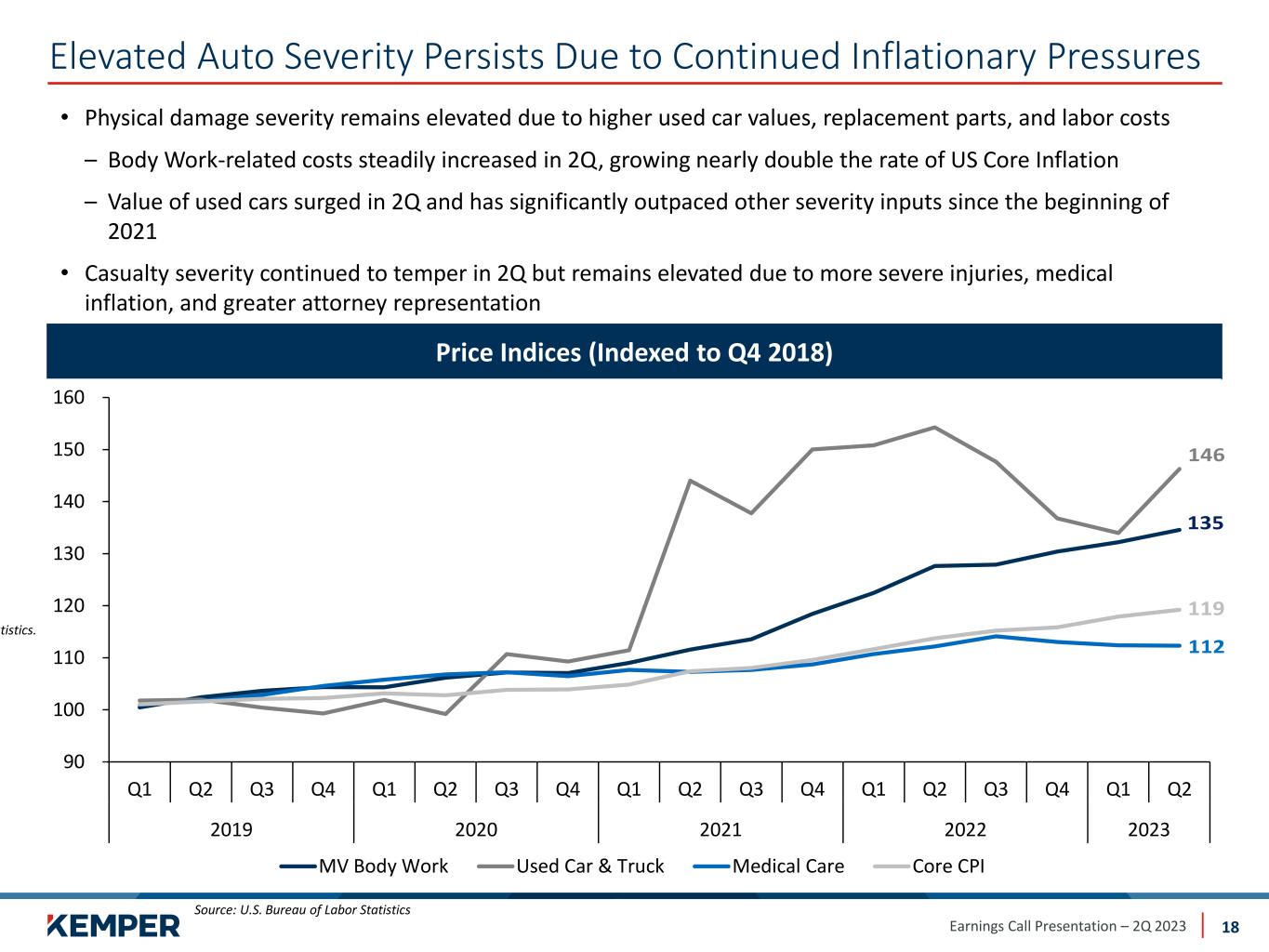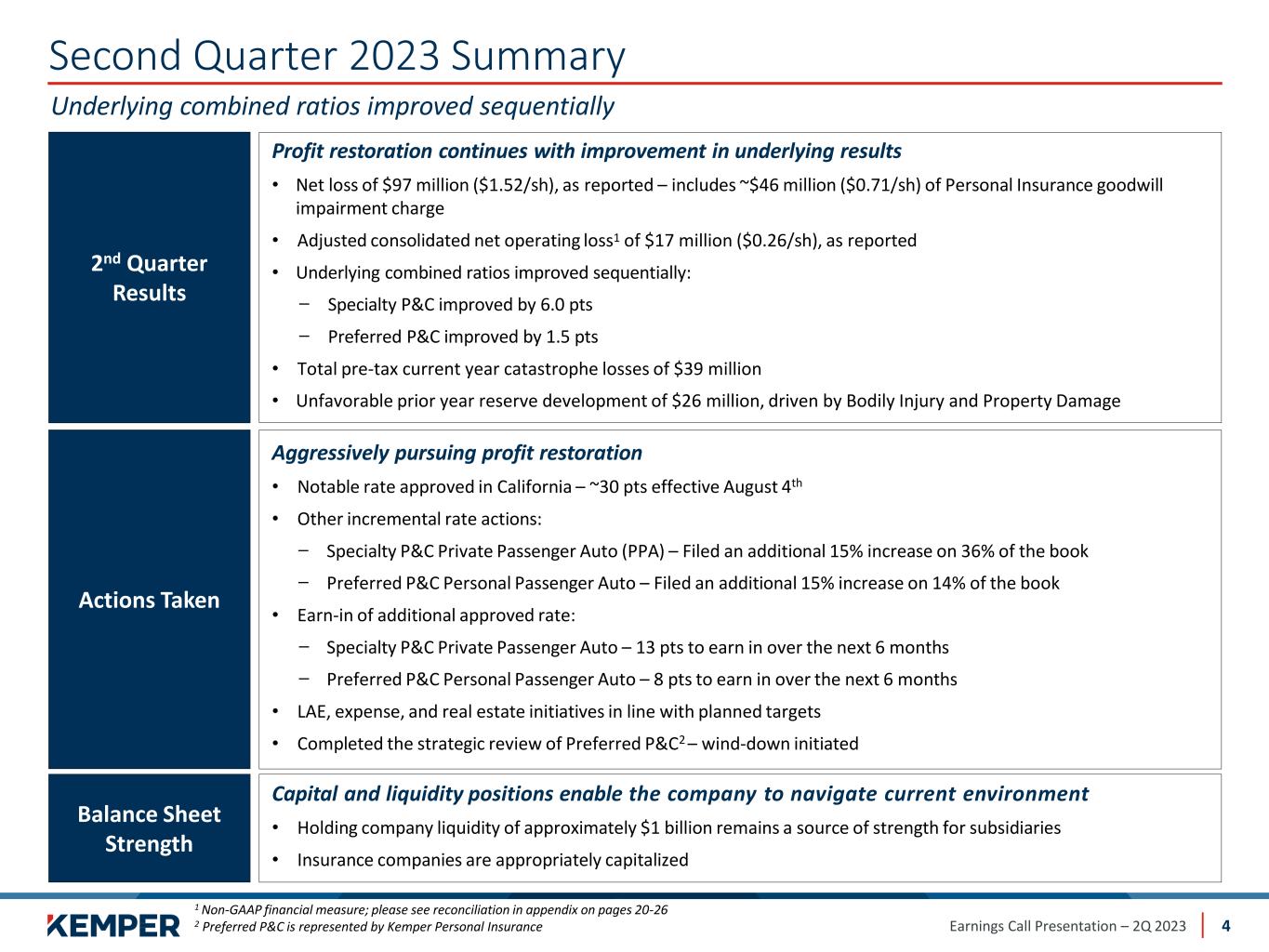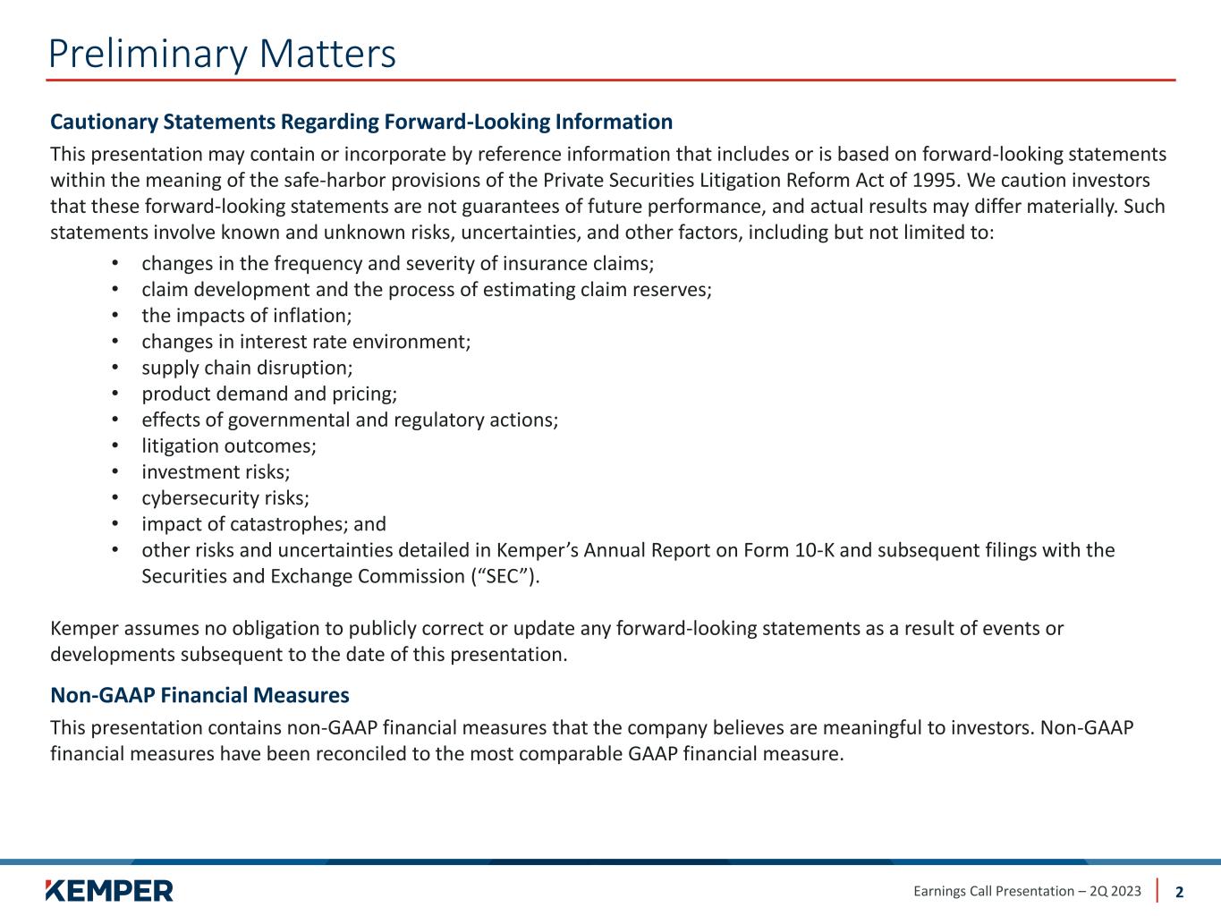 Earnings Call Presentation – 2Q 2023 Preliminary Matters 2 Cautionary Statements Regarding Forward-Looking Information This presentation may contain or incorporate by reference information that includes or is based on forward-looking statements within the meaning of the safe-harbor provisions of the Private Securities Litigation Reform Act of 1995. We caution investors that these forward-looking statements are not guarantees of future performance, and actual results may differ materially. Such statements involve known and unknown risks, uncertainties, and other factors, including but not limited to: • changes in the frequency and severity of insurance claims; • claim development and the process of estimating claim reserves; • the impacts of inflation; • changes in interest rate environment; • supply chain disruption; • product demand and pricing; • effects of governmental and regulatory actions; • litigation outcomes; • investment risks; • cybersecurity risks; • impact of catastrophes; and • other risks and uncertainties detailed in Kemper’s Annual Report on Form 10-K and subsequent filings with the Securities and Exchange Commission (“SEC”). Kemper assumes no obligation to publicly correct or update any forward-looking statements as a result of events or developments subsequent to the date of this presentation. Non-GAAP Financial Measures This presentation contains non-GAAP financial measures that the company believes are meaningful to investors. Non-GAAP financial measures have been reconciled to the most comparable GAAP financial measure.